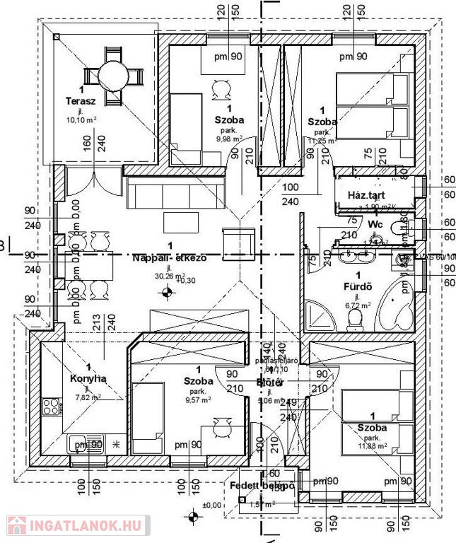Földszint: előtér, nappali, konyha-étkező, 4 szoba, 1 fürdő-wc, 1 wc,