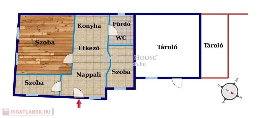 A 60-es években, vegyes falazatú, de túlnyomó részt téglából készült házban egy nagy, világos utcára néző szoba, két kisebb udvarra néző szoba, tágas amerikai tipusú konyhás, étkezős nappali, fürdő WC-vel kapott helyet. A ház folytatásában van egy nagy, jelenleg tárolónak használt helyiség amit lakószobává lehet alakítani és egy fedett, de a kert felől nyitott tároló is.