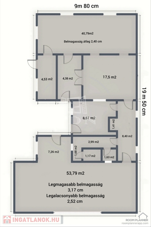 A több mint 150 m2-es ingatlan első fele élelmiszer boltként üzemelt, míg a hátsó plusz 50m-es szendvicspanelből hozzáépült részben pedig egy kisebb konditerem működött. Jelenlegi kialakításának köszönhetően 2 szoba, 1 nappali, konyha+ étkező, fürdőszoba+ wc illetve egy előszoba található. A vegyes falazatú ingatlan átlag belmagassága 240cm, nyílászárói fa szerkezetűek kivétel az első bejárati ajtó, mely hőszigetelt műanyag nyílászáróra lett cserélve. Az otthon melegét gázkonvektorok biztosítják, a meleg víz ellátását pedig villanybojler látja el.