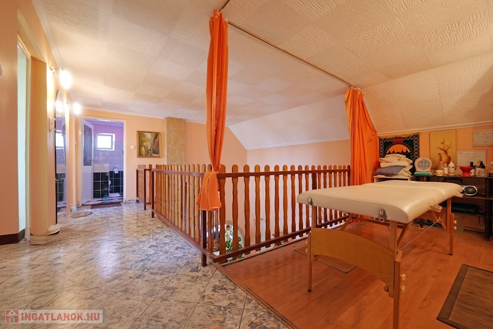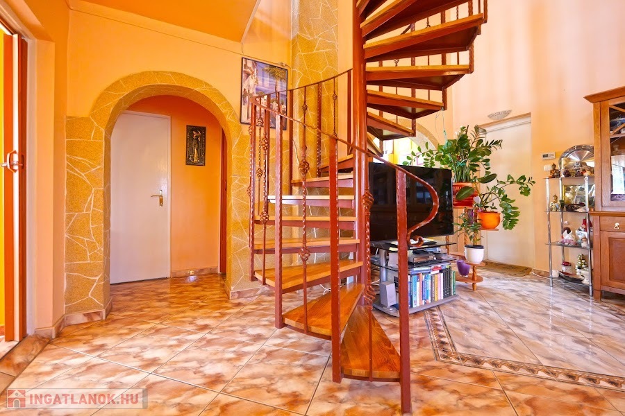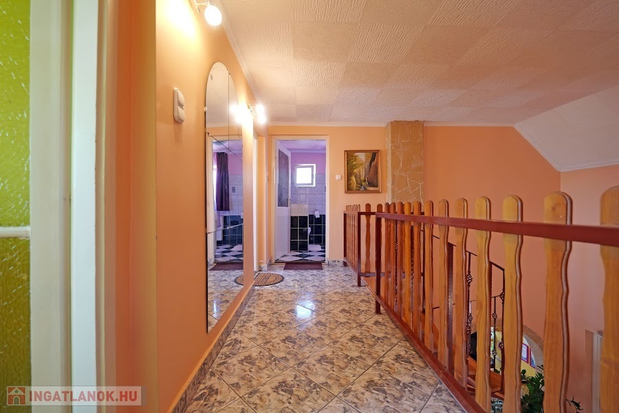 Az emeletre egy egyedi készítésű fa csigalépcső vezet, ahol az alábbi helységek találhatóak: