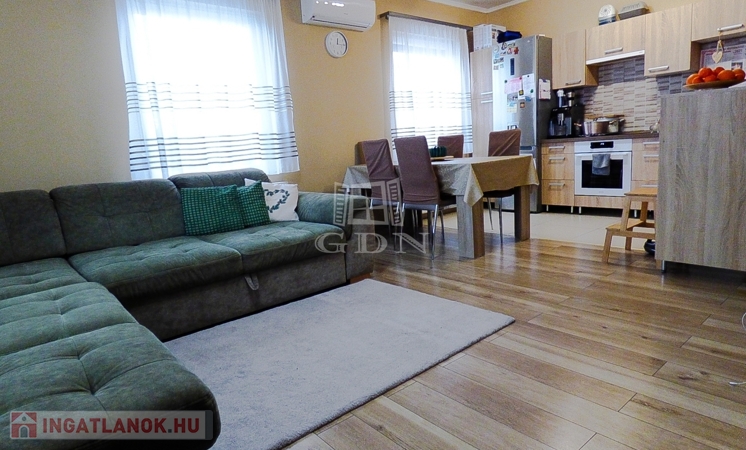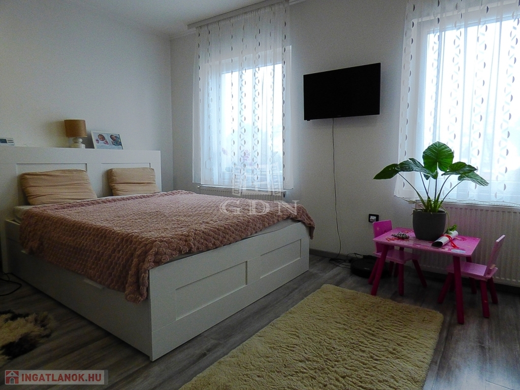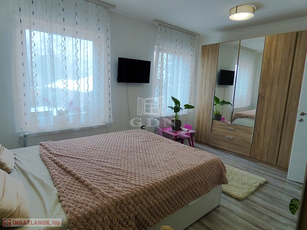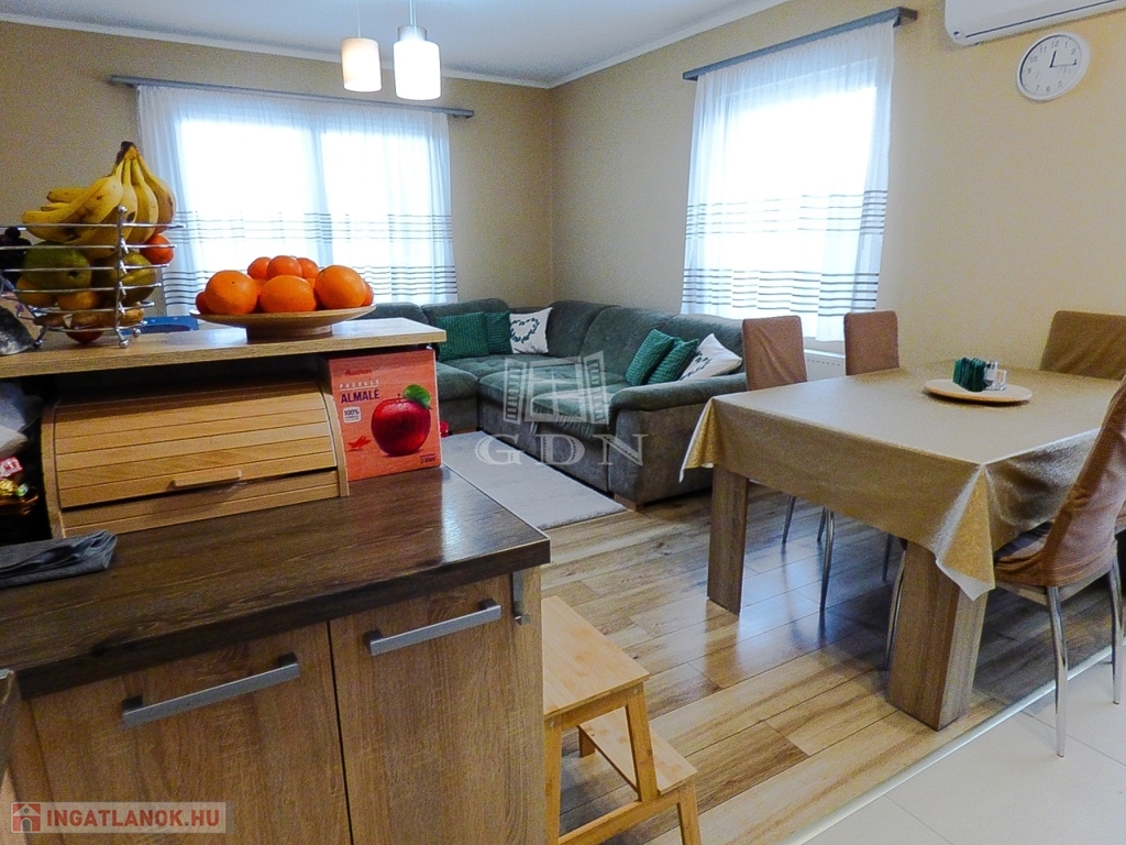 Műanyag thermo nyílászárókkal, redőnnyel, rovarhálóval, kondenzációs gáz cirkóval, klímával felszerelt.