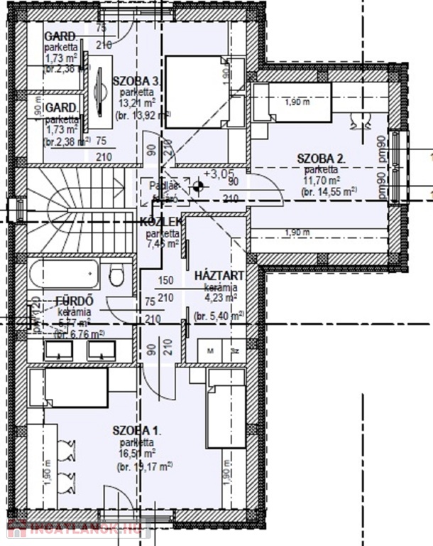 Emelet elosztása: közlekedő, 3 szoba, 2 gardróbszoba, fürdőszoba, franciaerkély.