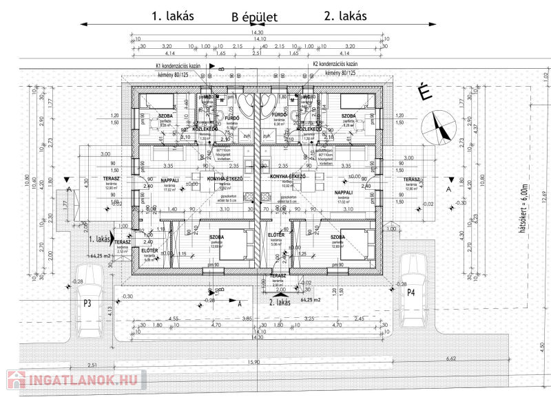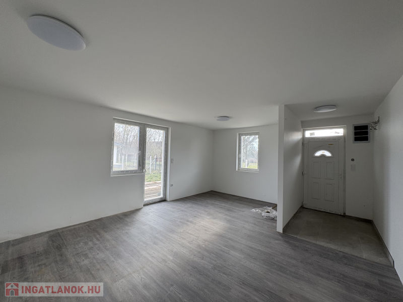60 m2-en amerikai konyhás nappali, 2 szoba, fürdőszoba, wc, előtér valamint 13 m2 kertkapcsolatos terasz található.