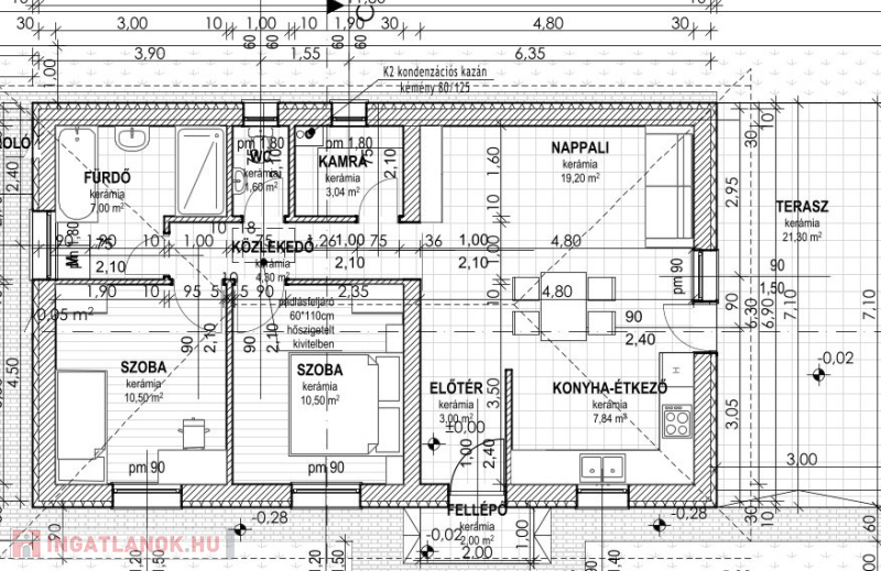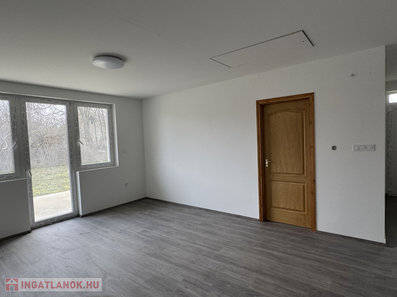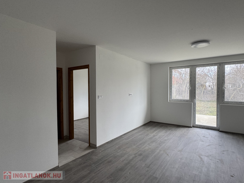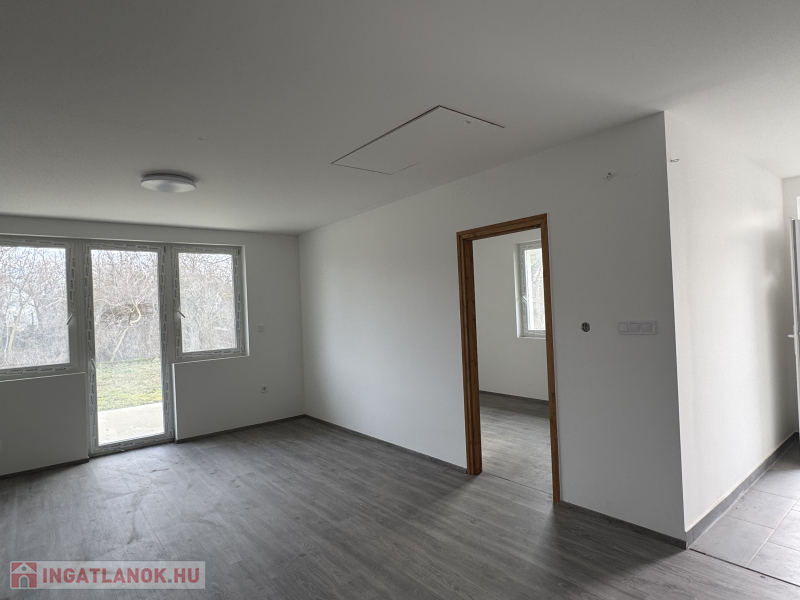 70 m2-en amerikai konyhás nappali, 2 szoba, fürdőszoba, wc, előtér valamint 21 m2 kertkapcsolatos terasz található.