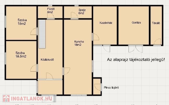 A déli fekvésű télikert üvegezett ajtajai és ablakai növelik a benti hőérzetet. Innen egy tágas közlekedőbe léphetünk, ahol DNY irányba két nagyméretű szoba, szemben a fürdő és a stabil emeleti lépcső található. Keletre (jobbra) egy nagyméretű konyha, kamra és a házzal kapcsolatos kazánház helyezkedik el. A nappali egy kis része alápincézett.