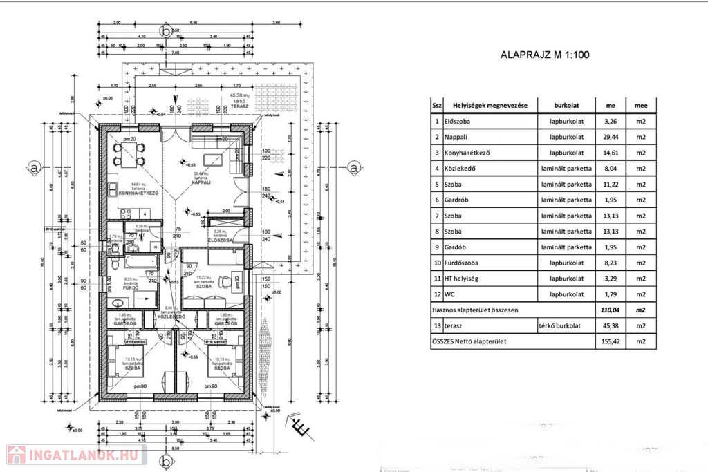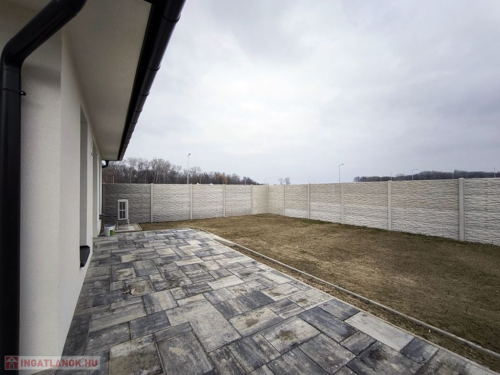 A 110 m2-es ház helyiségei: amerikai konyhás nappali, 3 hálószoba, 2 gardrób, fürdőszoba, WC, háztartási helyiség, közlekedő, szélfogó. A házhoz egy 45,38 m2-es L alakú, térkövezett terasz is épült, ami részben vagy egészben befedhető.