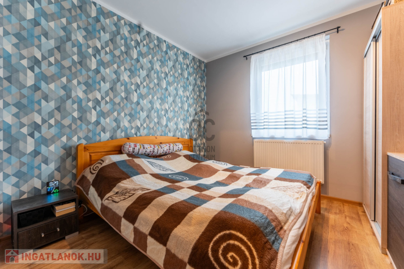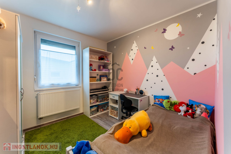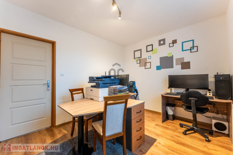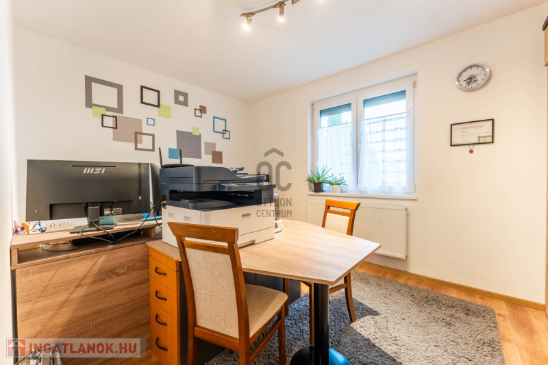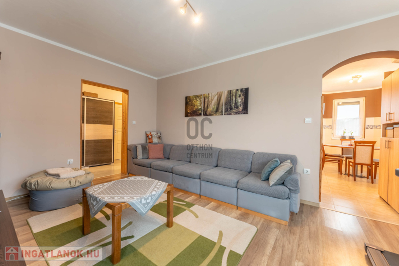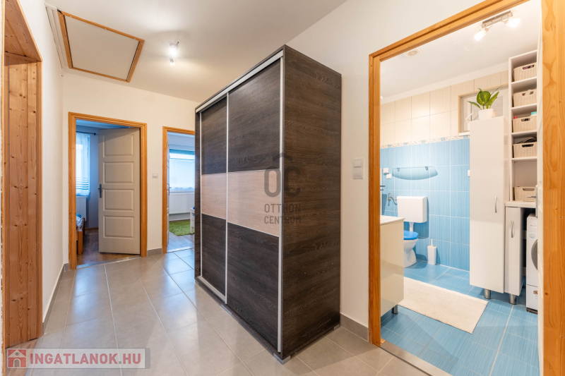 -helyiségek: 3 hálószoba, nappali, tágas konyha–étkező, WC-kézmosó, fürdőszoba,