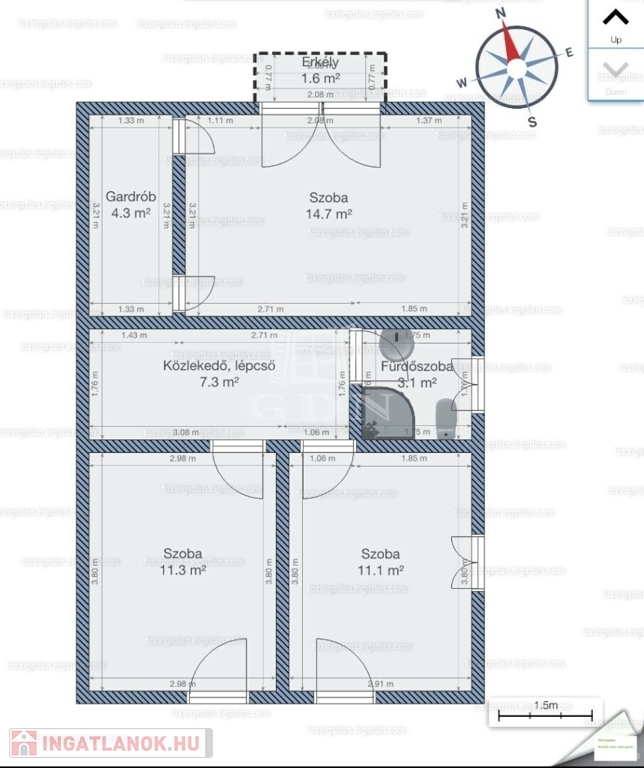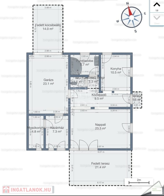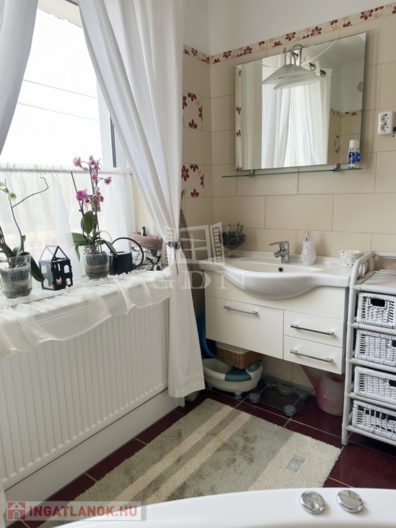Az ingatlanba lépve az egy légtérben található közlekedő, konyha-étkező, nappali részre érkezünk. Innen nyílik egy sarokkádas fürdőszoba, egy mellékhelyiség, a lépcsőház az emeletre, illetve a házban lévő fűtött garázs felőli bejárat. A nagyméretű műanyag ablakoknak köszönhetően az egész élettér világos és barátságos. A nappaliból egy fedett terasz biztosítja a kertkapcsolatot. Az emeleti szinten két félszoba, egy fürdő w.c.-vel, valamint egy erkélyes hálószoba kapott helyet, kilátással a Gödöllői dombságra. A garázson keresztül érhető el a mosókonyha és kazánház ahonnan szintén kiléphetünk a kertbe, valamint a nagyméretű spájz is.