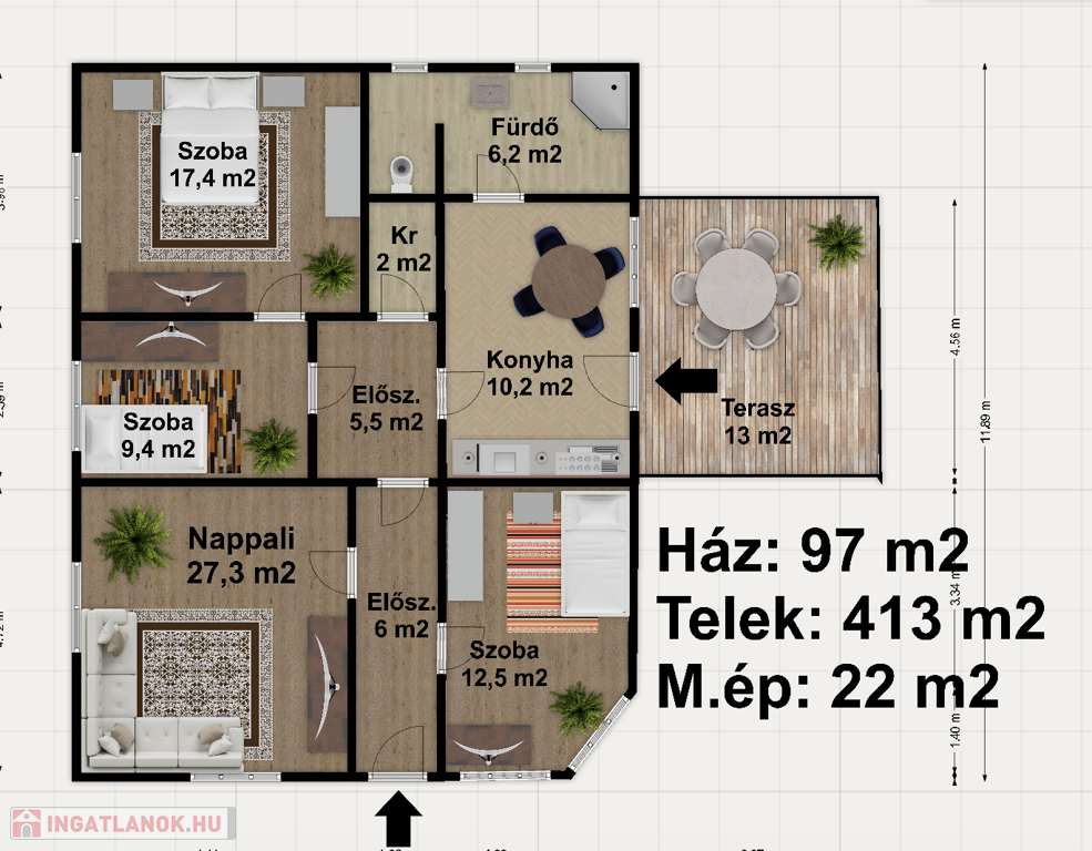 - Az 413 m2-es telken, a ház mellett található egy 13 m2-es fedett terasz és egy 22 m2-es több helyiségből álló tároló