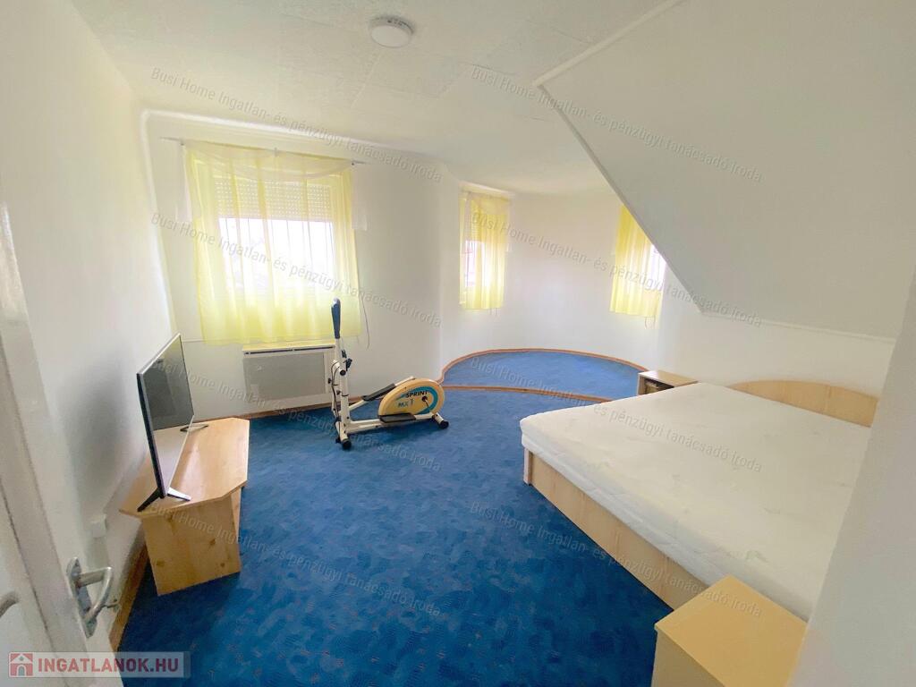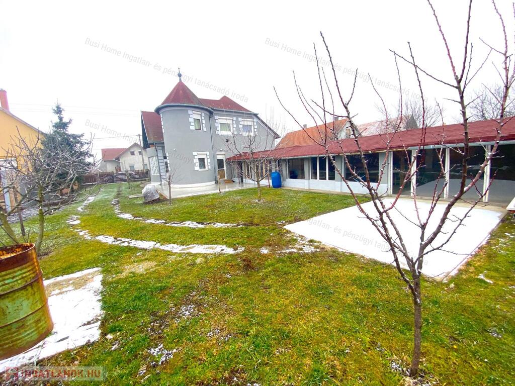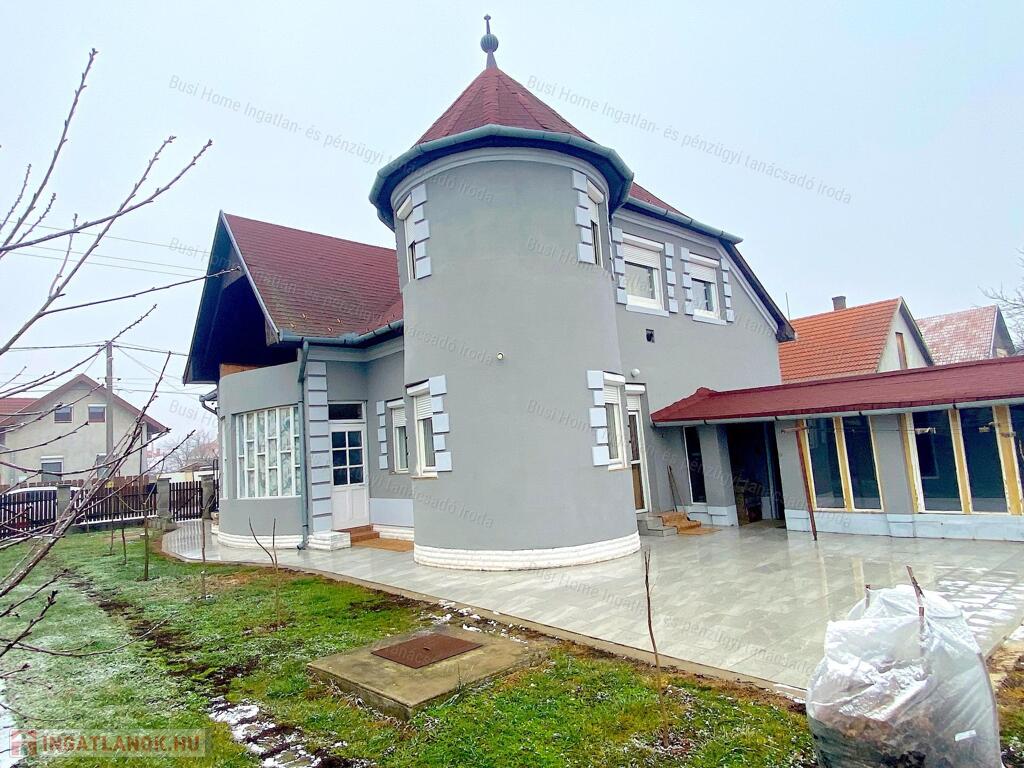 Mezőtúron a Kertvárosban eladó, egy 782 m2-es telekre épült, 222 m2-es, 6 szobás + 2 nappalis, étkező-konyhás, 2 szintes családi ház, hangulatos kör alakú, csúcsos toronnyal. (kiskastély). Az ingatlan folyamatosan karbantartott, jó állapotú, vállalkozásra is alkalmas nagy melléképülettel rendelkezik.