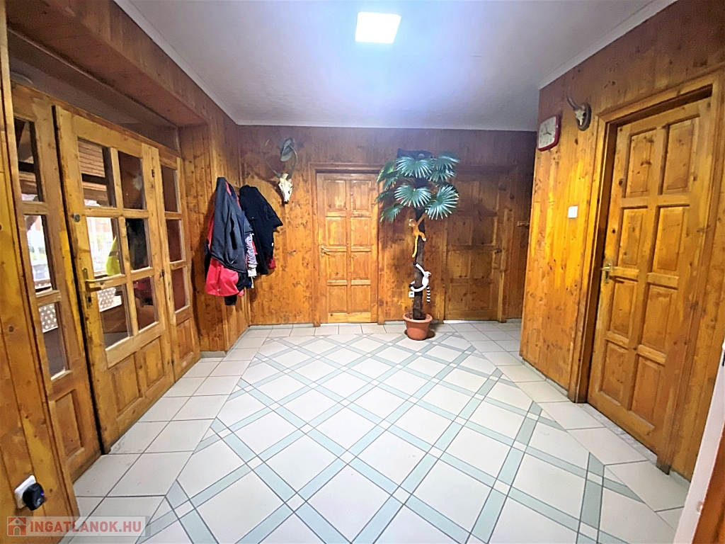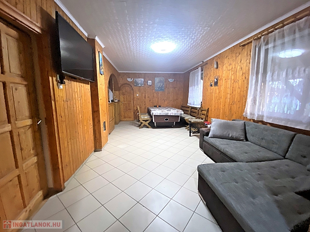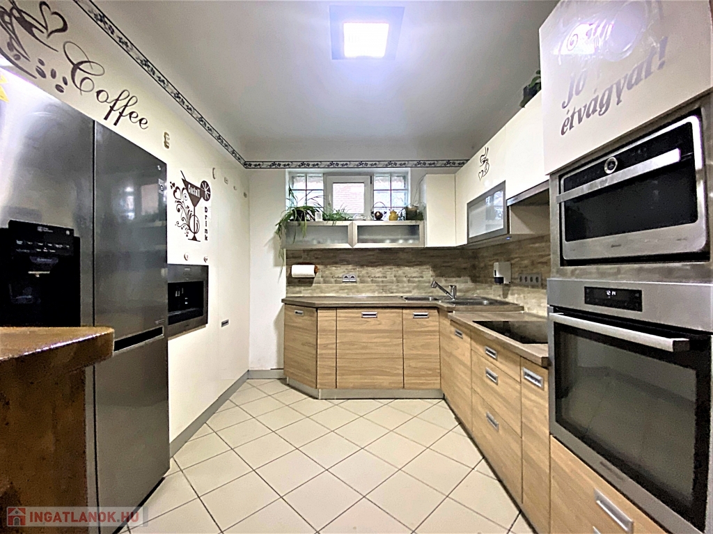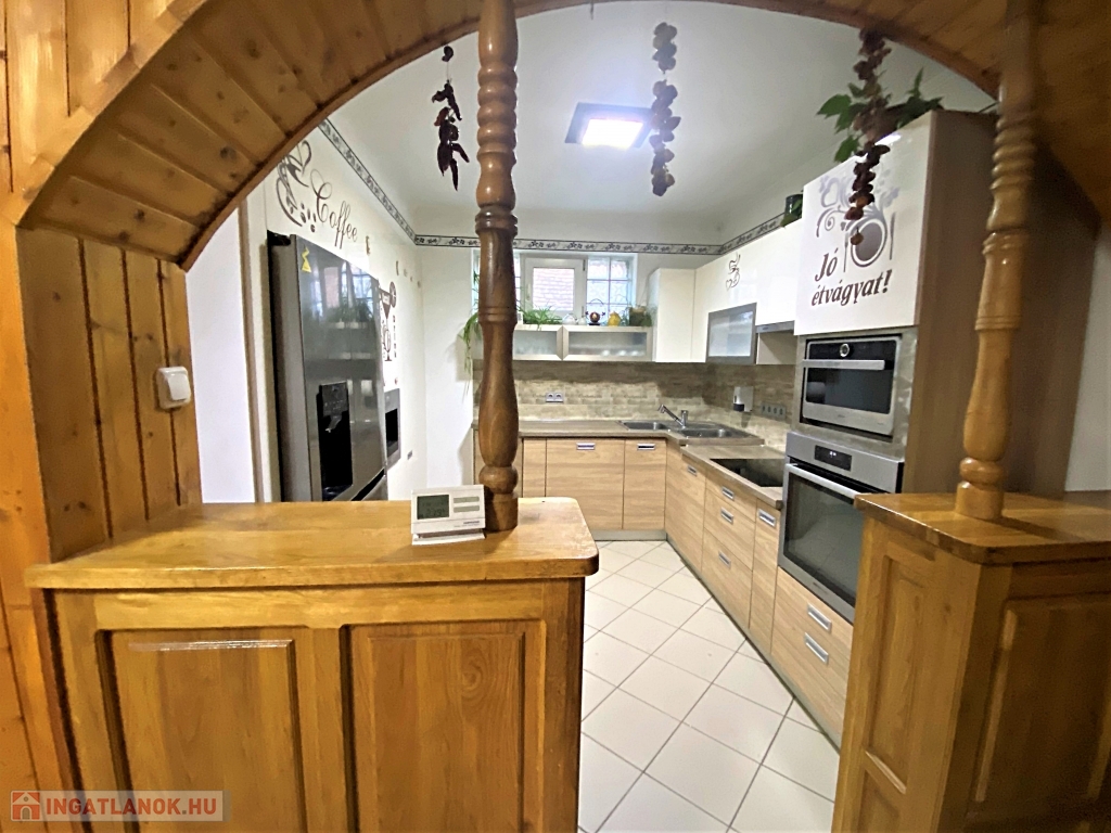 A belső terek nagy része lambériával burkolt, ami egyrészt esztétikus és könnyen tisztán tartható, másrészt egy plusz szigetelést nyújt. A zuhanyzós fürdőszoba márványmintás csempével burkolt. A vidám hangulatú, teljes felszereltségű konyhában a bézs árnyalatai kaptak hangsúlyt, a beépített kávégép és hűtő mellett egy szekrényt is rejt a magas fényű bútorlapból készült ajtó. A tágas nappaliban kényelmesen elfér egy nagy tagú család is.