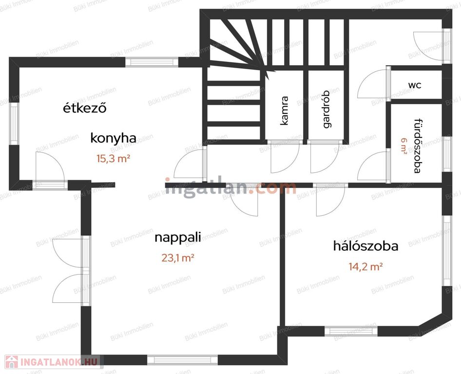 Az alsó szinten a nappali körbe napozott, nagy ablakain keresztül egész nap fényárban úszik. A boltíves falon át jutunk el az étkezőhöz és a konyhához, ahonnan közvetlen kijárat nyílik a hangulatos teraszra, így a családi vagy baráti összejövetelek természetes folytatása lehet egy közös kávézás vagy vacsora a szabadban. Ezen a szinten található még egy világos, sarokkádas fürdőszoba nagy ablakkal, amely mögött nincs szomszédház, így teljes intimitást és zavartalan kikapcsolódást biztosít. Külön helyiségként és a fürdőn belül is megtalálható a mellékhelyiség, emellett egy praktikus gardrób segíti a rendszerezett tárolást, aminek köszönhetően a mindennapi élet jóval rendezettebbé válik. Az alsó szinten egy hálószoba is helyet kapott, ami ideális lehet vendégszobának, dolgozószobának vagy akár idősebb családtagnak.