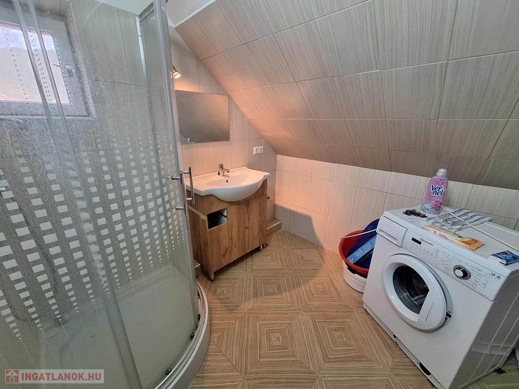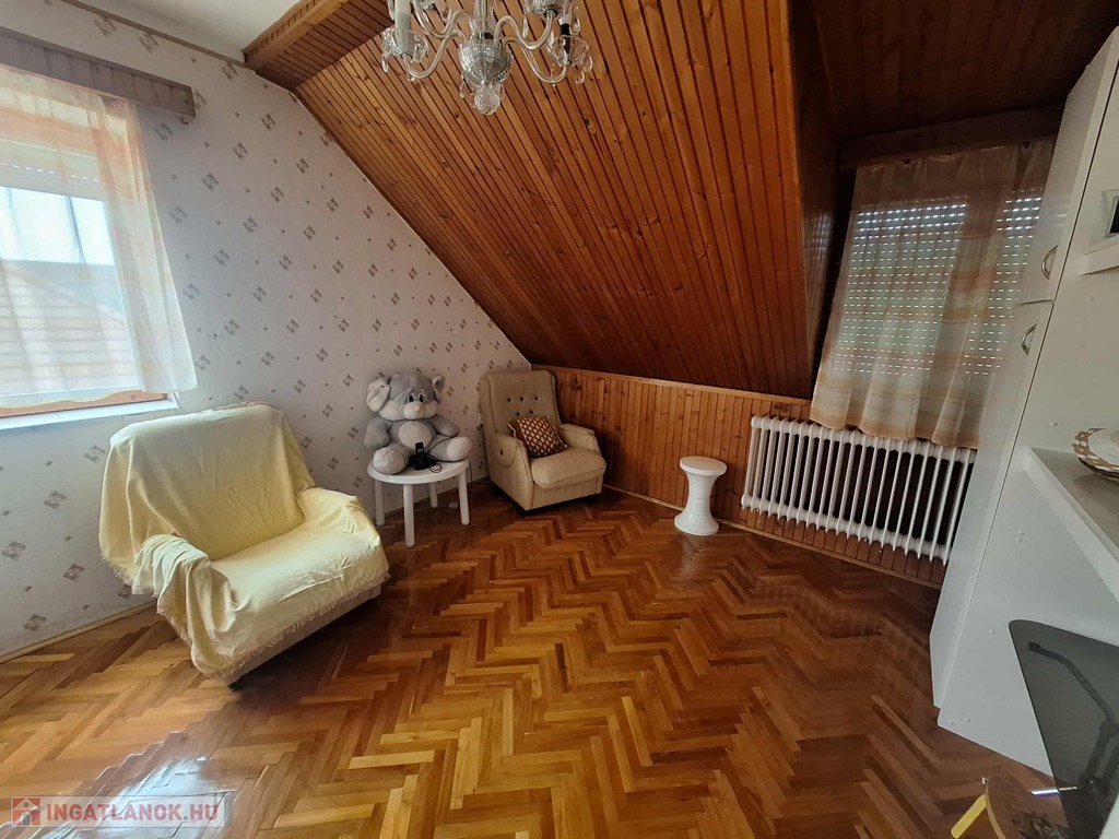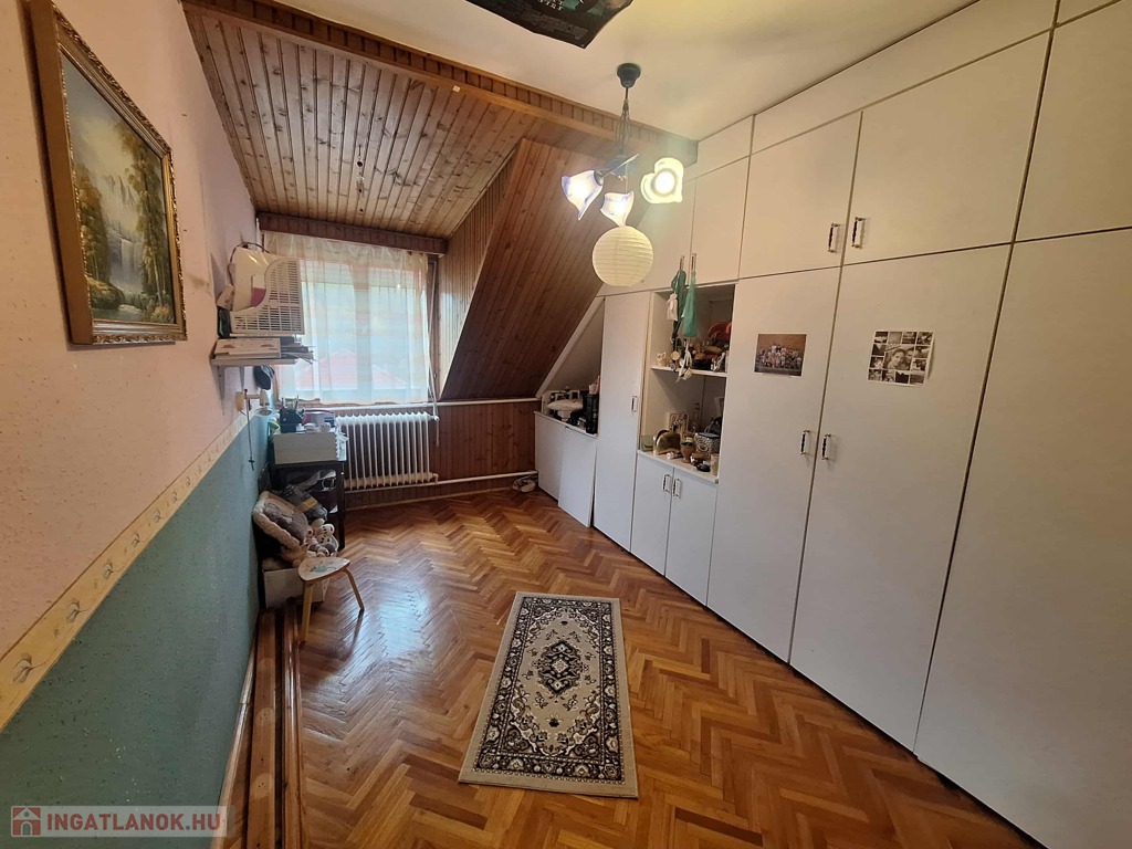 A felső szinten egy nagyszoba és három kisebb szoba kapott helyet, valamint fürdőszoba, konyha, spájz, közlekedő és egy különálló WC. Itt még a villanyvezetékek cseréje nem történt meg, de a vízvezetékek már újak, amit a fürdőszoba felújításakor cseréltek ki. A nyílászárók duplaüveges, hőszigetelt fa ablakok, ahonnan csodálatos kilátás nyílik a környező erdős részre. A panoráma fantasztikus!
