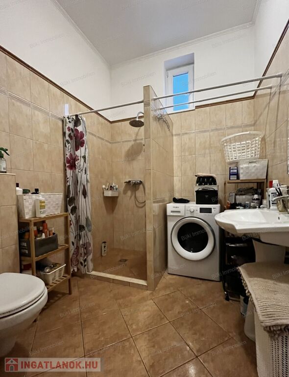 A fürdőszoba felújítása során modern burkolatok és praktikus elrendezés került kialakításra. A meleg vizet és a fűtést BOSCH kombi kazán biztosítja, emellett a pincében egy vegyes tüzelésű kazán is rendelkezésre áll — ez nagy érték a mai energiaárak mellett, és alternatív fűtési lehetőséget kínál.