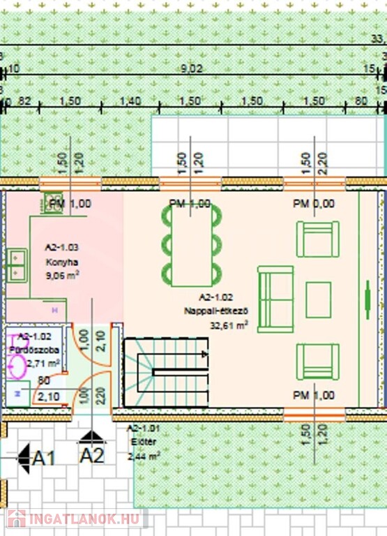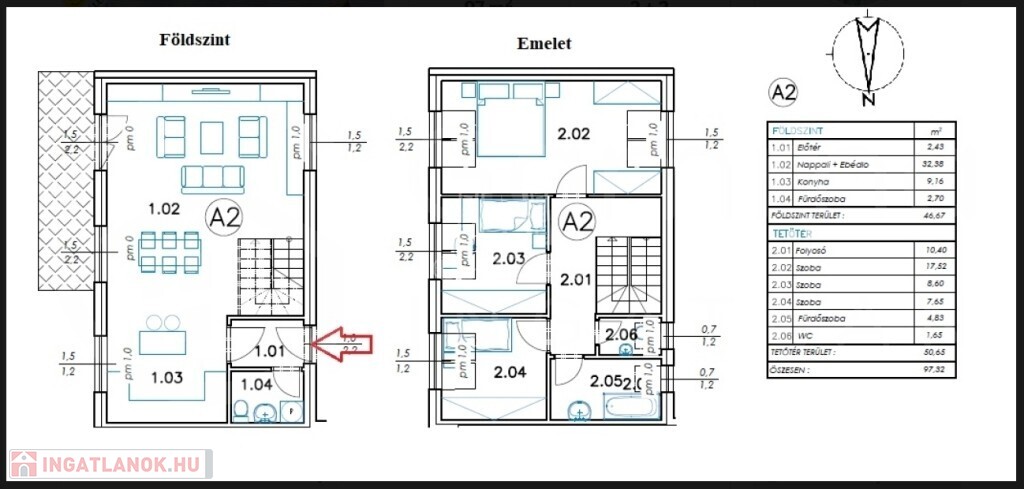 • Földszint: Tágas, napfényes amerikai konyhás nappali étkezővel, valamint egy vendég mosdó-WC.