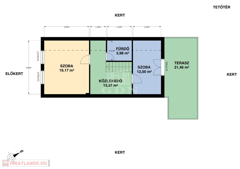 A tetőtérhez kb 15 nm nagyságú lapos erkély tartozik.