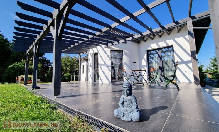 A nappaliból közvetlenül egy hatalmas, ~50 négyzetméteres külső teraszra léphetünk, amely elegáns antracit színű, modern burkolatot kapott.
