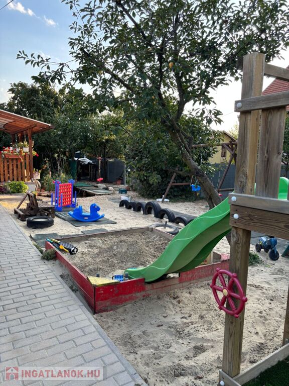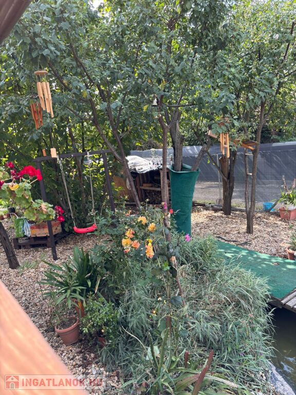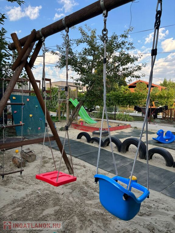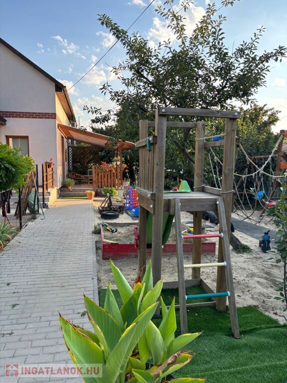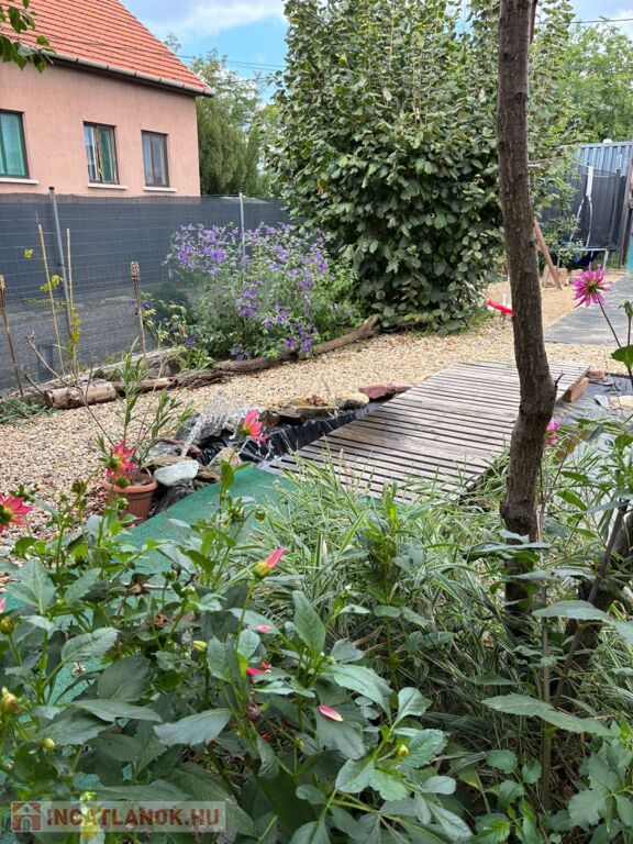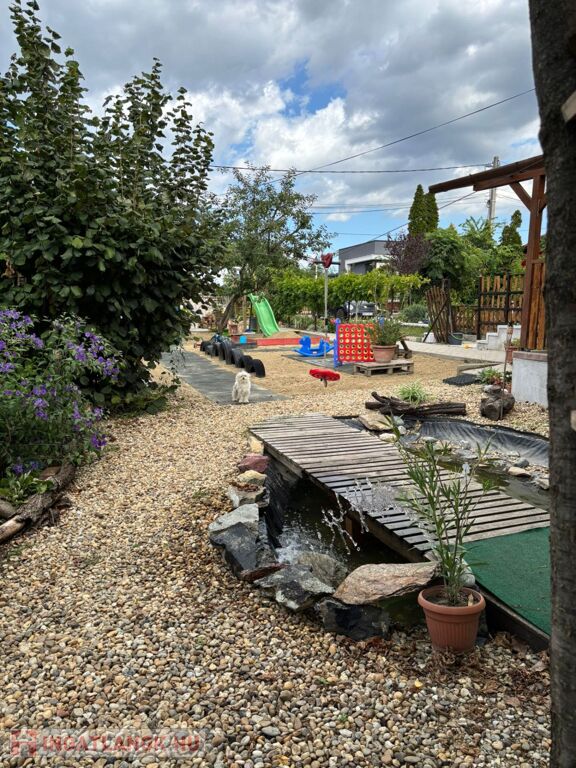 A 1000nm-es telek gyermekbarát játszótérrel, kerti tóval, konyhakerttel, örökzöldekkel és termő gyümölcsfákkal (füge, körte, mogyoró, naspolya) teremt nyugalmat és privát oázist.