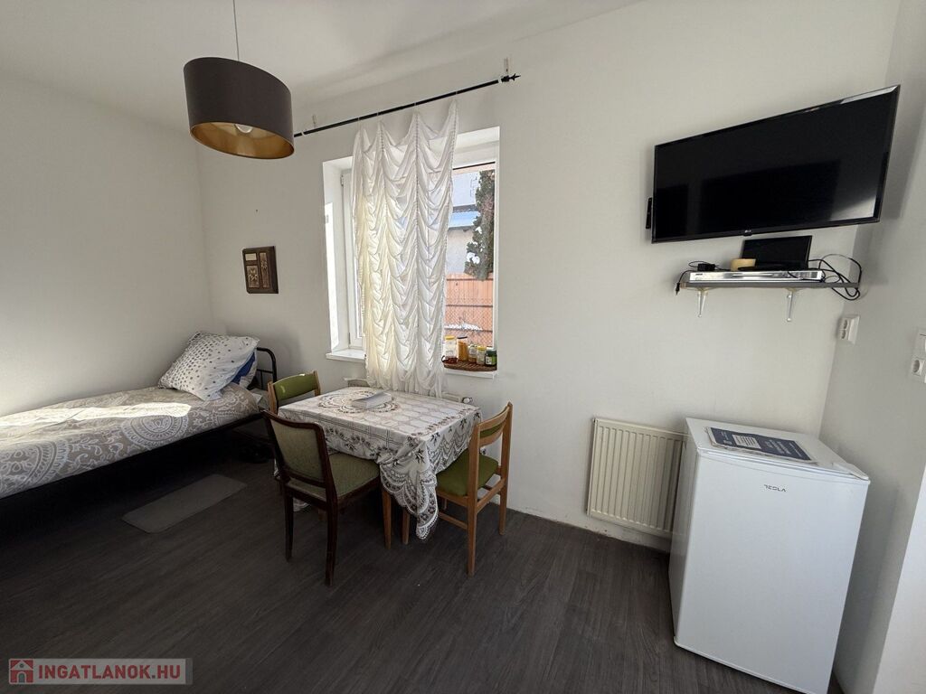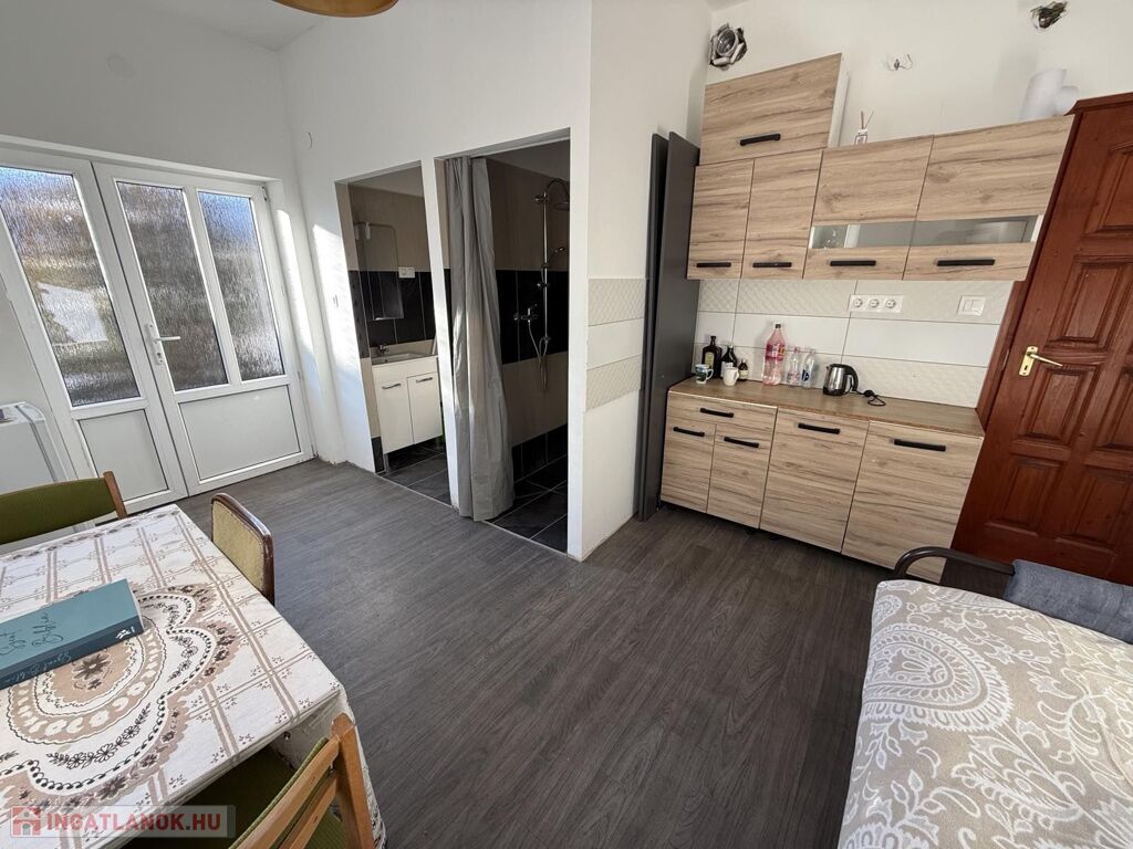 - 12nm-es nyitott teraszról nyíló stúdiólakás: háló, gardrób, konyhasarok, zuhanyzó, mosdó, Wc.