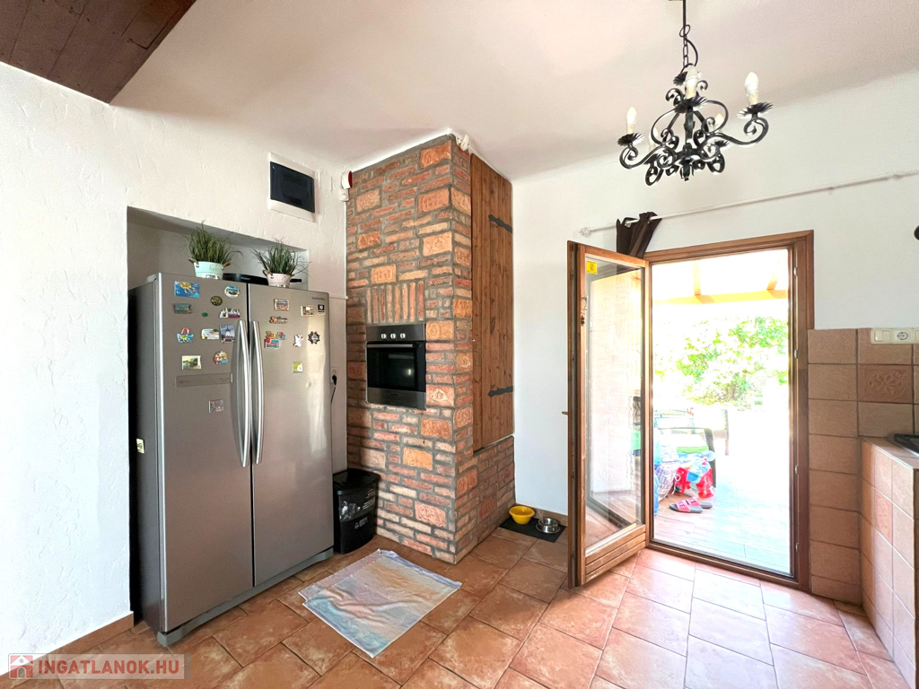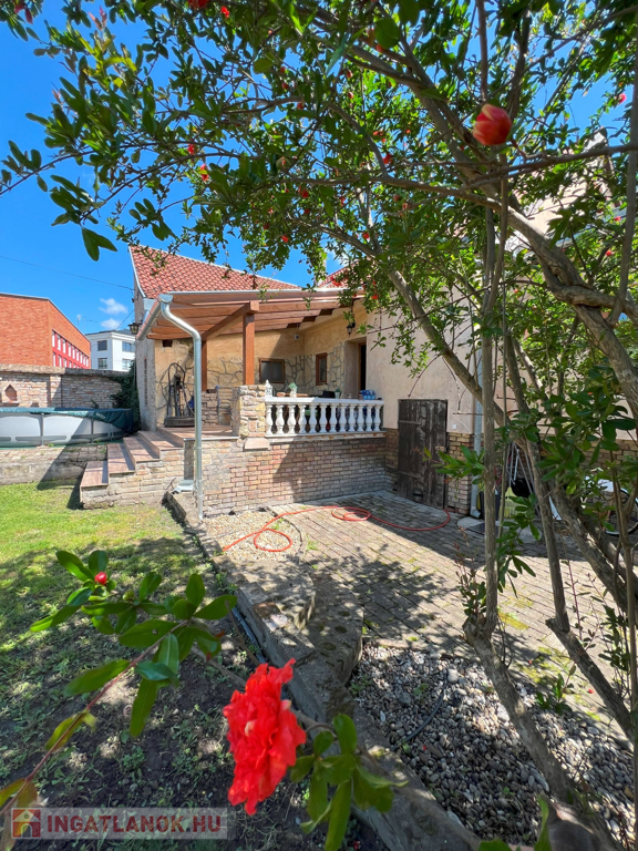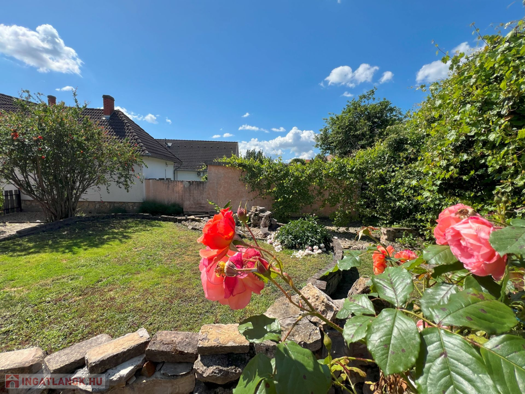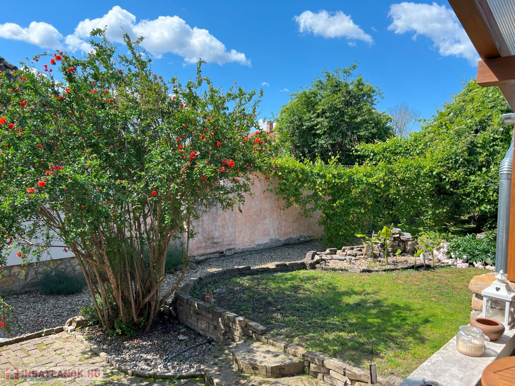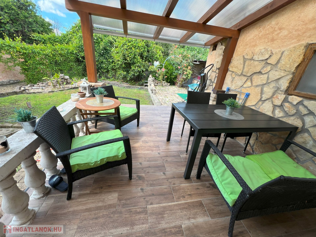 Telek: Az 560 m²-es telek szépen gondozott, díszbokrokkal, virágokkal szegélyezett kertjében fedett grillező kapott helyet, amely kiválóan alkalmas baráti összejövetelek, családi vacsorák helyszínéül.