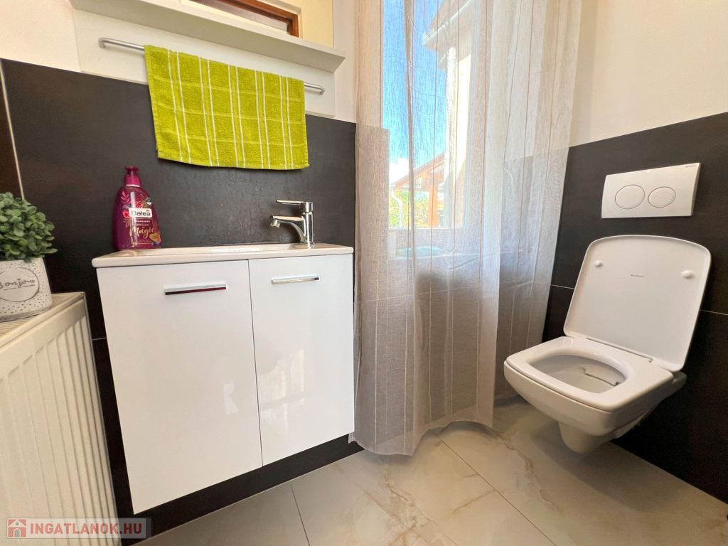 Az alsó szinten tágas előszoba fogadja a vendégeket, melyből egy légtérben kialakított konyha-nappali nyílik. Innen közvetlenül kiléphetünk a hangulatos fedett teraszra – ahol a reggeli kávézások vagy az esti borozások valódi élménnyé válnak. Ezen a szinten található még egy kényelmes hálószoba, egy fürdőszoba és egy külön vendég-WC is. A fürdőszobán keresztül juthatunk át a hálószobába, így biztosítva az intim, elszeparált pihenőteret. A hálóban egy praktikus, nagy beépített szekrény is helyet kapott, amely elegáns megjelenésével és nagy tárolókapacitásával a mindennapok kényelmét szolgálja.