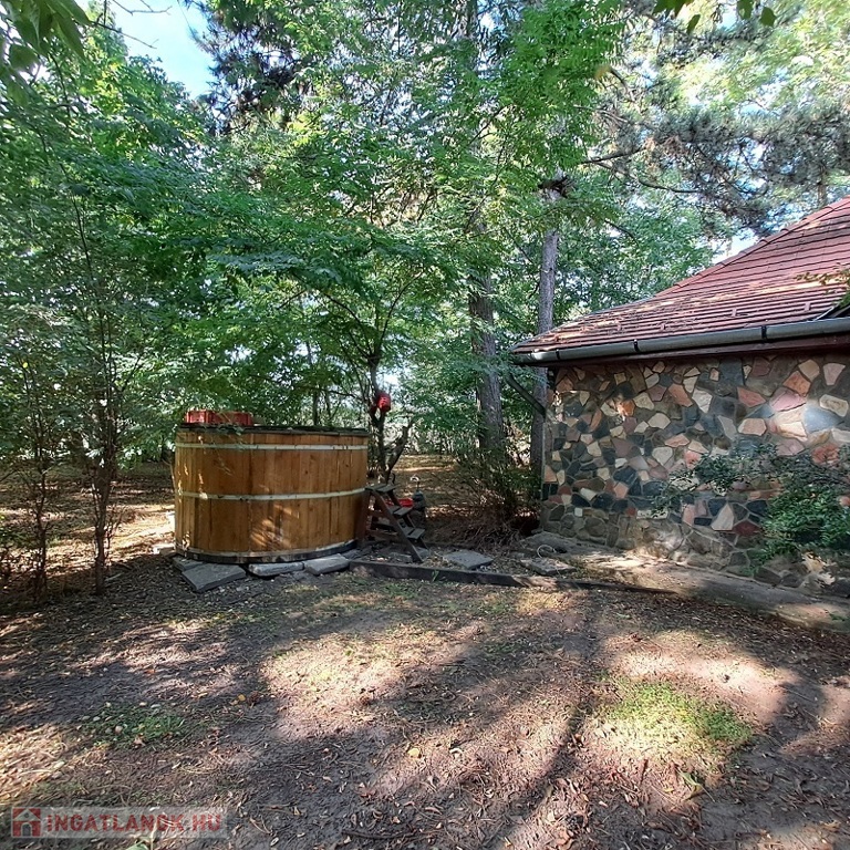 A telken található egy faház, mely kb. 14 m2, belül teljesen lambériázott, akár szauna is kialakítható benne, ezen kívül egy fával fűthető DÉZSA FÜRDŐ.