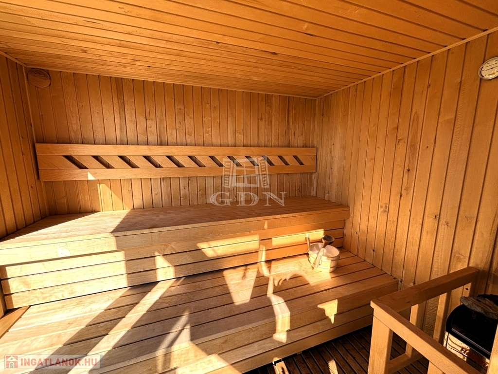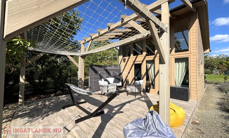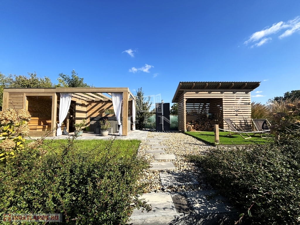 - KÜLÖNÁLLÓ WELLNESS ÉPÜLET szaunával, dézsával, kinti zuhanyzóval, FEDDETT PIHENŐRÉSSZEL és hangulatos esti világítással.
