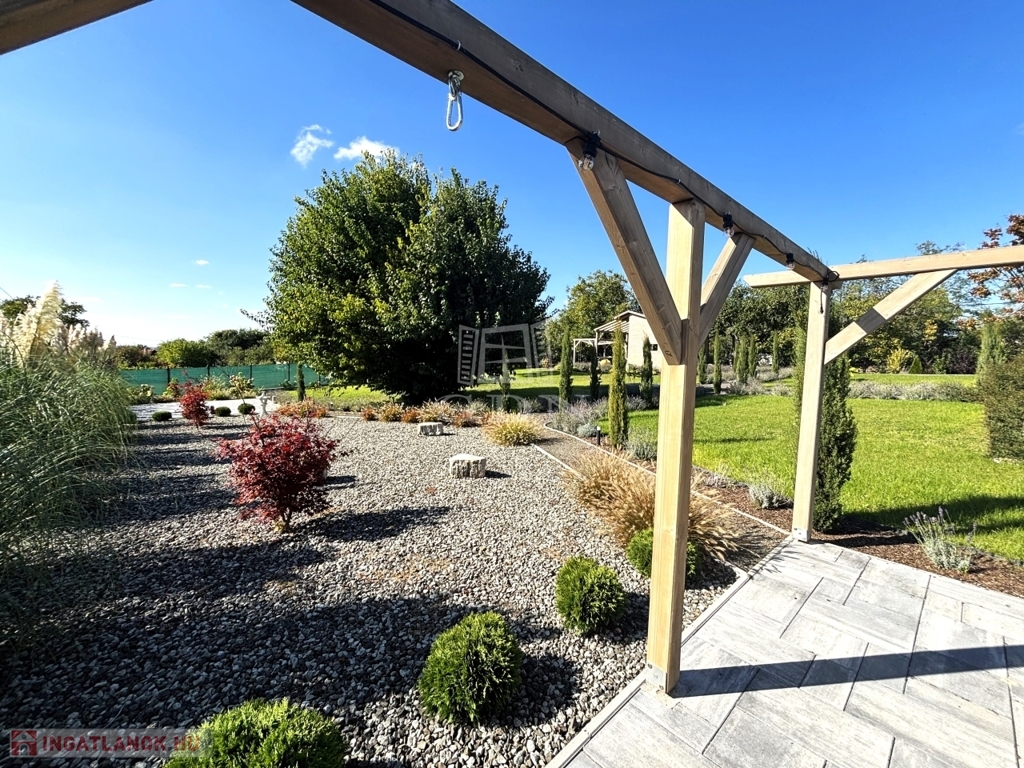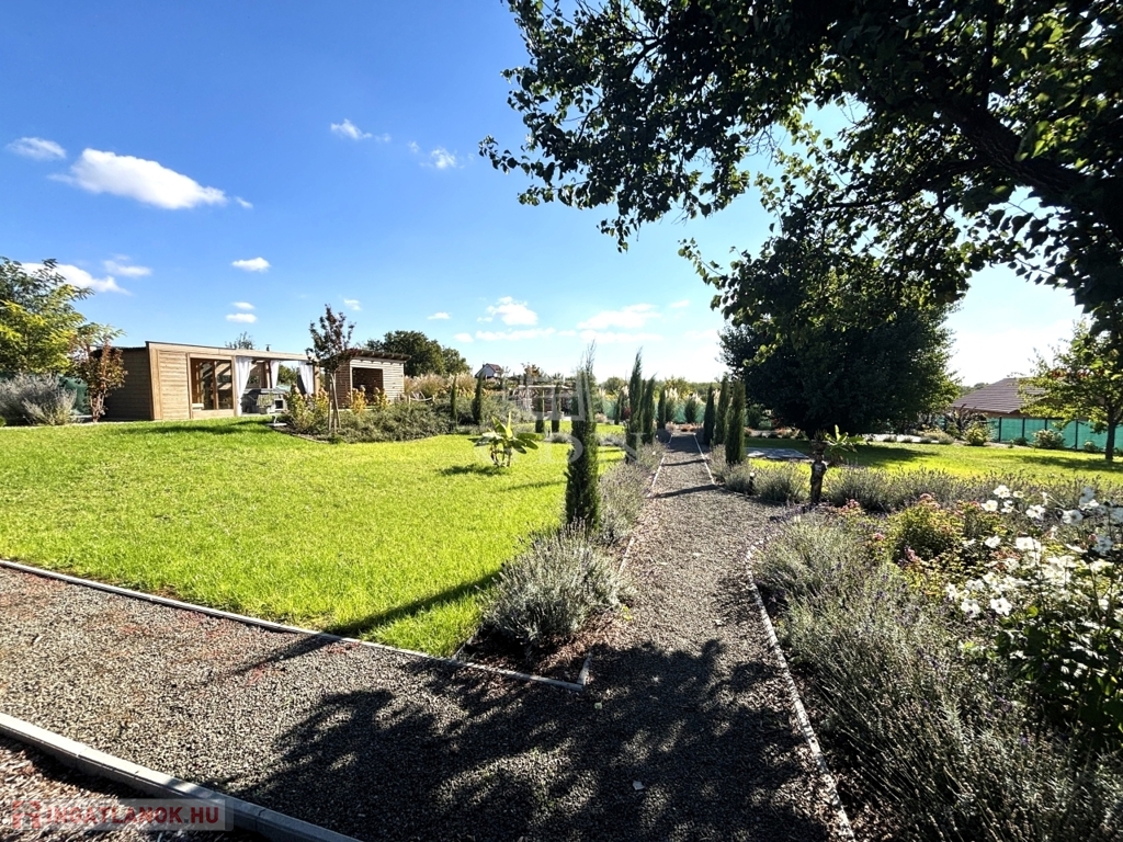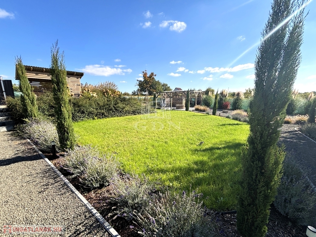 - A KÖRBÉKERÍTETT, füvesített kert dísznövényekkel és KERTI SÜTÖGETŐVEL, került kialakításra.
