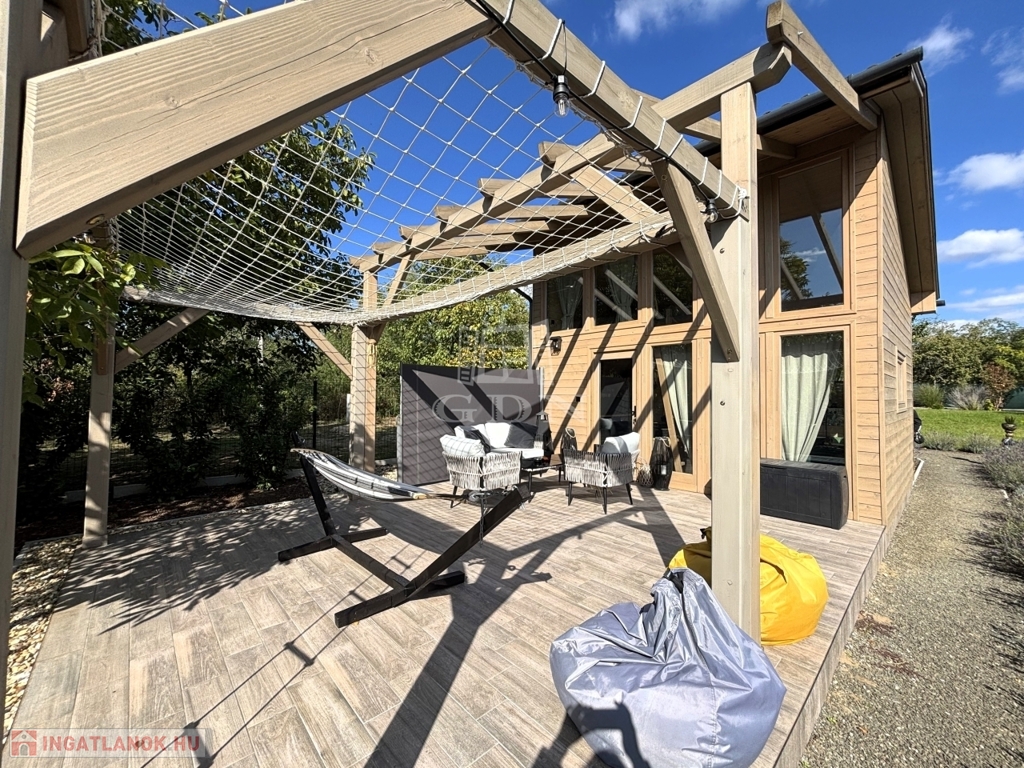 Eladó Monor csendes részén, 2136 m²-es nyugodt, gyönyörűen PARKOSÍTOTT telken ahol a belső béke és a természet harmóniája találkozik, egy 28 m²-es galériás modern faház SZIGETELÉSSEL és thermo üvegezéssel.