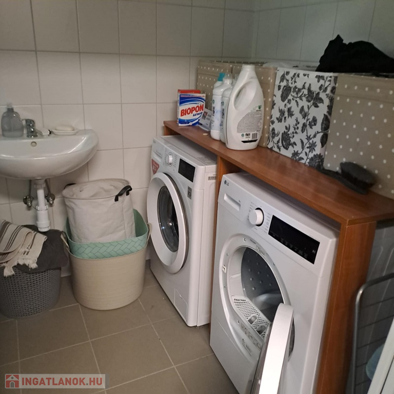 A földszinten előszoba, közlekedő, konyha-étkező-nappali, 1 nagyszoba és fürdőszoba található, de ezen kívül egy 35 m2-es garázs (elektromos garázsajtóval), mosókonyha (itt ki van alakítva WC és zuhany is) és egy fedett terasz is tartozik a házhoz!