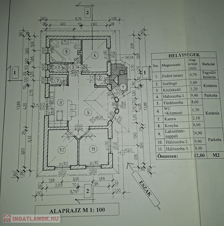 Lakóterülete 76 m2, melyben előszoba, konyha-étkező-nappali, kamra, 3 hálószoba, fürdőszoba és WC található. Ezen kívül egy fedett, 10 m2-es terasz is tartozik az ingatlanhoz.