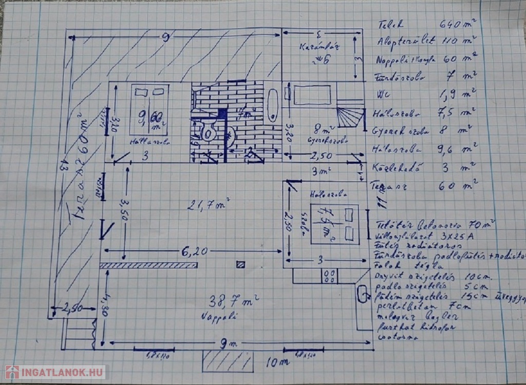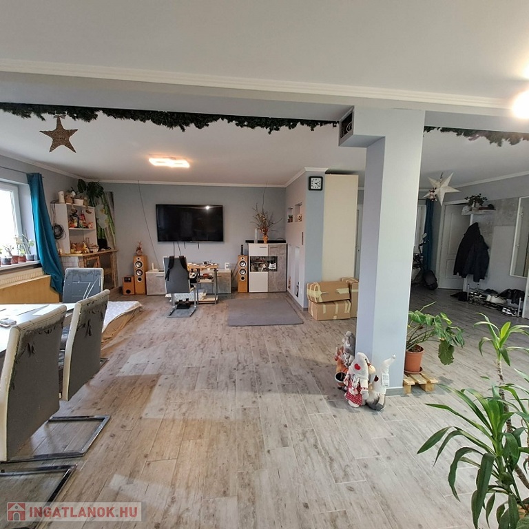 Az ingatlan lakóterülete 97,4 m2, melyben nappali, 3 félszoba, fürdőszoba (kád és zuhanyzó is ki van építve), közlekedő, valamint WC található. A házhoz „L” alakú kb. 60 m2-es fedett terasz is tartozik. A tetőtér 70 m2, mely csak betonozva van.