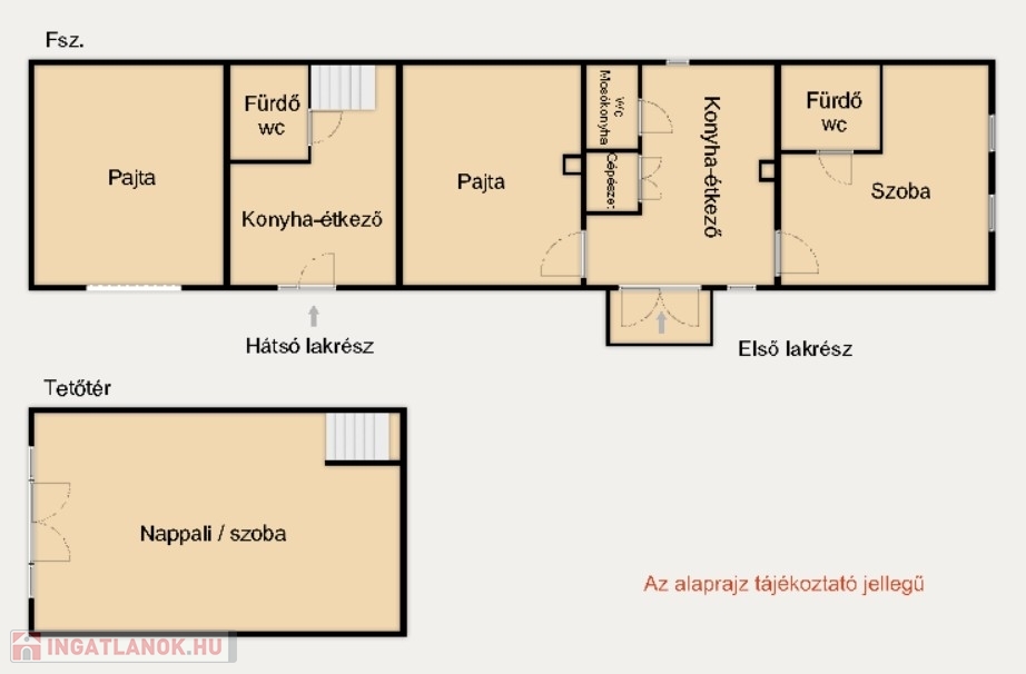 A hátsó lakrész (65nm-es) kétszintes: alul egy tágas konyha-étkező található ill. a fürdőszoba, az emeleten egy nagy szoba mely a pajta felett is elhúzódik. A szoba ablakából gyönyörű panoráma nyílik a környező hegyekre.