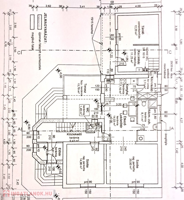 wc (1,49m2), nappali (20m2) - étkező (14,03m2) - konyha (7,1m2), speiz (3,83m2), kazánház (11,25m2), tároló (12,2m2) fürdő (8,11m2), terasz (19,79m2).