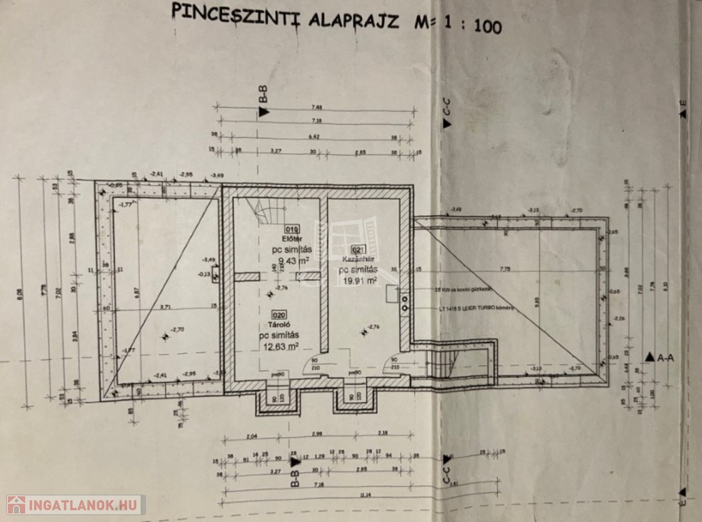 A ház részben alápincézett, melynek mérete: 42 m2. Itt lett kialakítva a kazánház is.