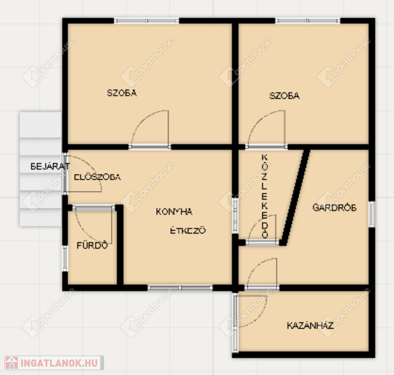 belső terek kialakítása jelen állapotában: előszoba, fürdőszoba, konyha-étkező, két külön nyíló kényelmes méretű szoba, közlekedő, fél szoba