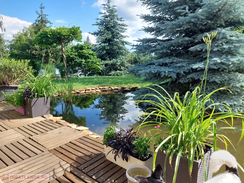 Kert: Örökzöld sövény, díszfák és egy hangulatos kerti tó díszhalakkal.