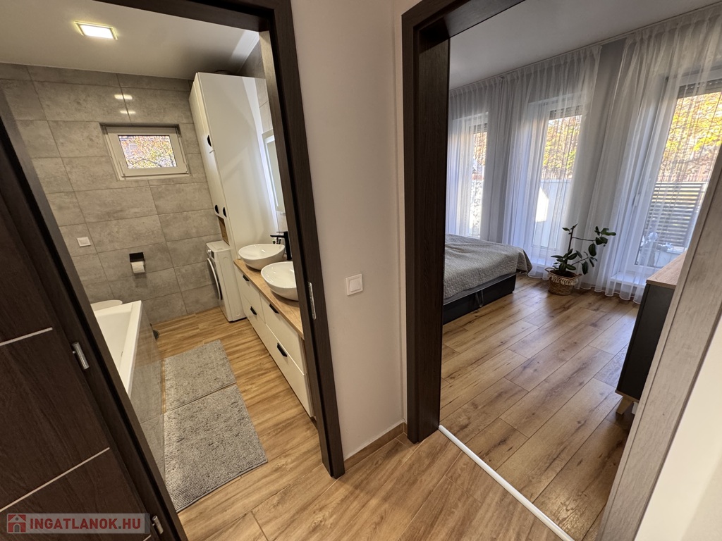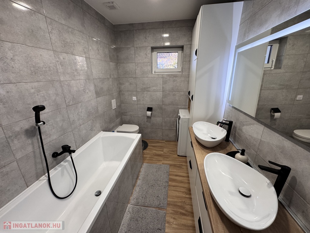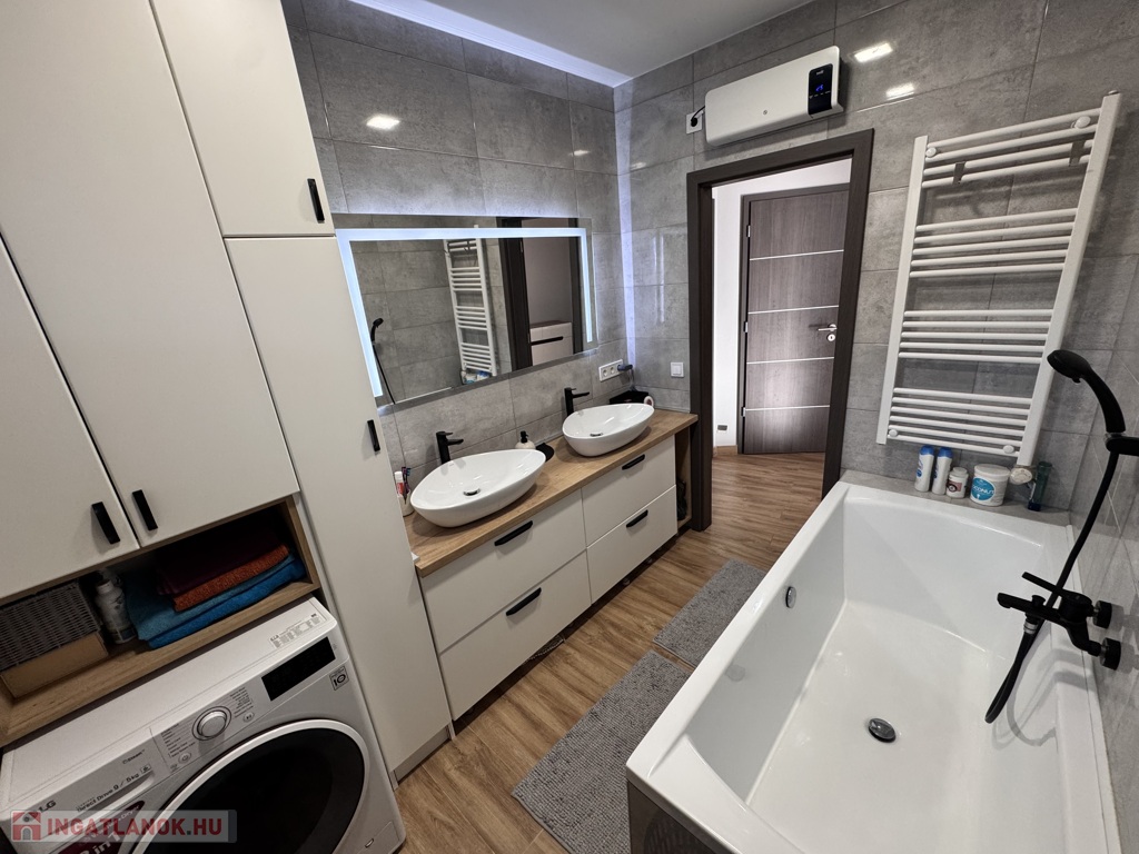 • Elegáns, kádas fürdőszoba két mosdóval, WC-vel és beépített szekrénnyel (benne elrejtett mosógéppel).