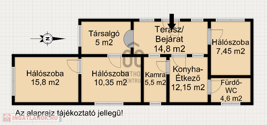 - helyiségek: 2 hálószoba, +1 félszoba, konyha- étkező, terasz vagy előszoba, fürdő- WC