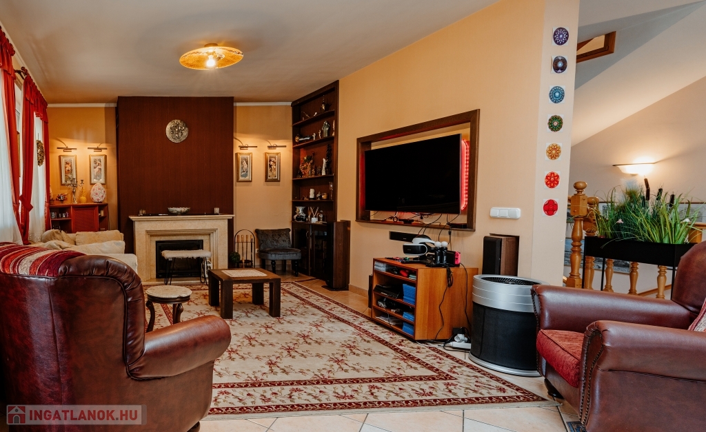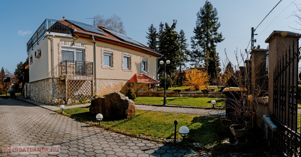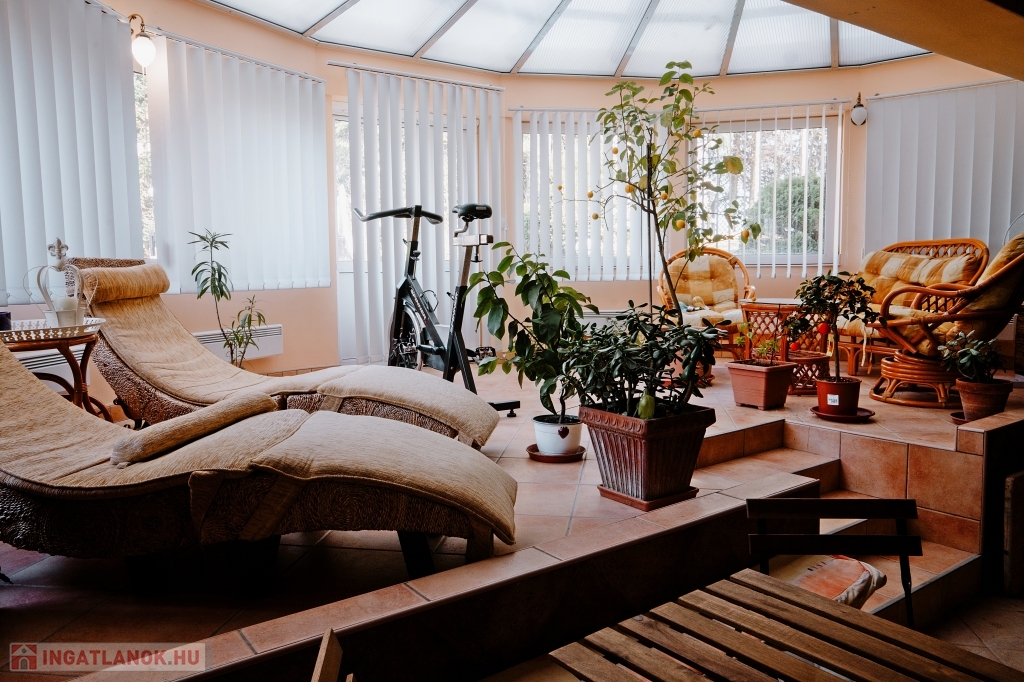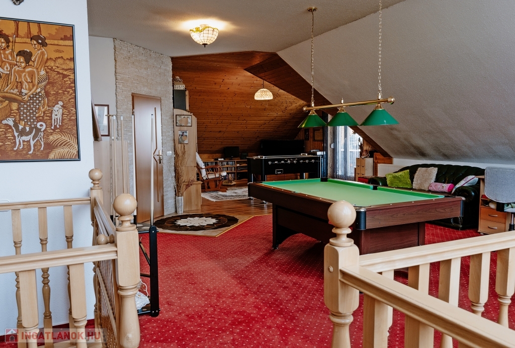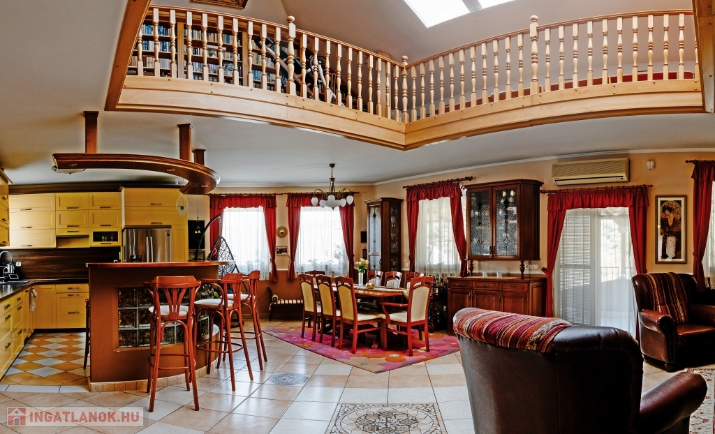 A ház háromszintes, összesen 447 m² alapterületű, plusz egy 26 m²-es panorámás és egy 30 m²-es kertre néző terasz tartozik hozzá, valamint egy 60 nm-es garázs, ahol akár három gépkocsit is biztonságban tárolhat. Az ingatlanban 5 szoba + 2 tágas nappali áll rendelkezésre, ahol kedvére élhet biliárd szenvedélyének, vagy elvonulhat egy keleti kialakítású sarokba vízipipázni, de ha dolgozni vágyik, ezt is megteheti egy csendes, kellemes kialakítású helyiségben. Ha azonban wellnessezne családjával vagy barátaival, az alagsor erre a célra lett kialakítva. A szauna mellett, egy automata vízforgatós, falfűtéses medence pezsgőfürdővel várja a pihenni vágyókat. Téli napokon egy nagy család is kényelmesen összegyűlhet a kandalló körül a nappaliban, a galériás előtérben kényelmesen elfér a négy méteres karácsonyfa is.