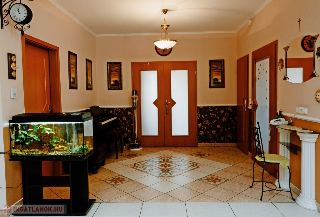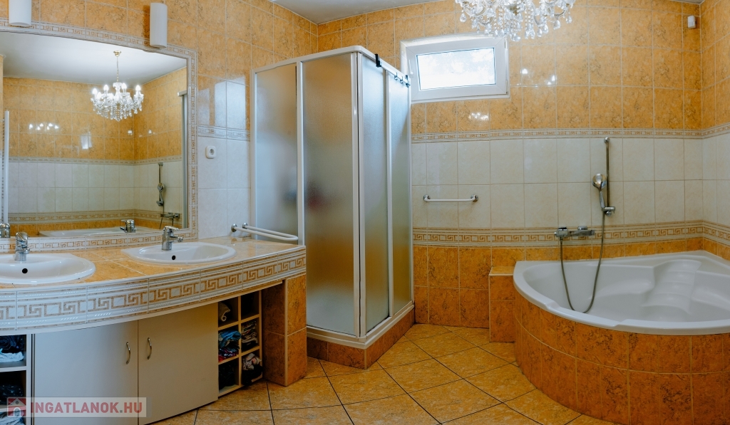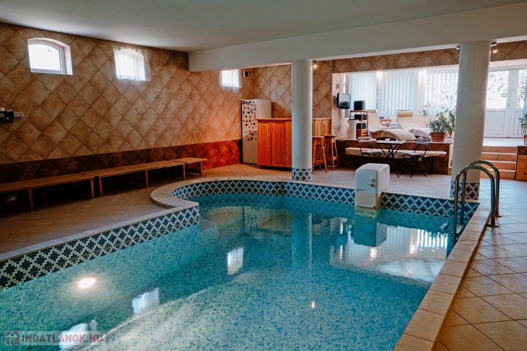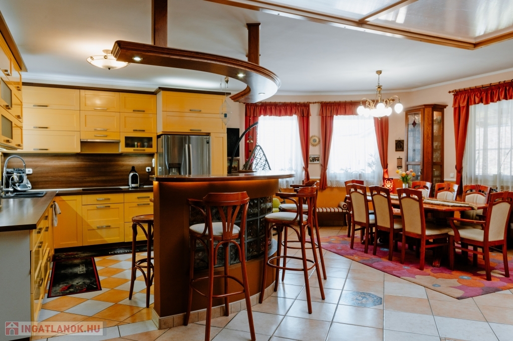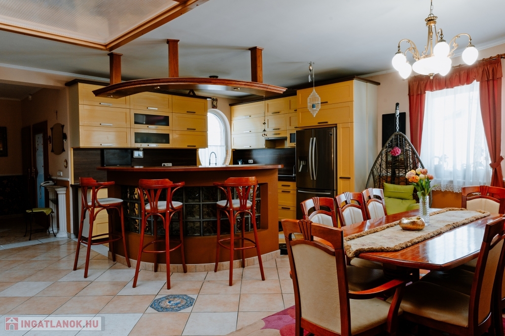 A ház háromszintes, összesen 447 m² alapterületű, plusz egy 26 m²-es panorámás és egy 30 m²-es kertre néző terasz tartozik hozzá, valamint egy 60 nm-es garázs, ahol akár három gépkocsit is biztonságban tárolhat. Az ingatlanban 5 szoba + 2 tágas nappali áll rendelkezésre, ahol kedvére élhet biliárd szenvedélyének, vagy elvonulhat egy keleti kialakítású sarokba vízipipázni, de ha dolgozni vágyik, ezt is megteheti egy csendes, kellemes kialakítású helyiségben. Ha azonban wellnessezne családjával vagy barátaival, az alagsor erre a célra lett kialakítva. A szauna mellett, egy automata vízforgatós, falfűtéses medence pezsgőfürdővel várja a pihenni vágyókat. Téli napokon egy nagy család is kényelmesen összegyűlhet a kandalló körül a nappaliban, a galériás előtérben kényelmesen elfér a négy méteres karácsonyfa is.