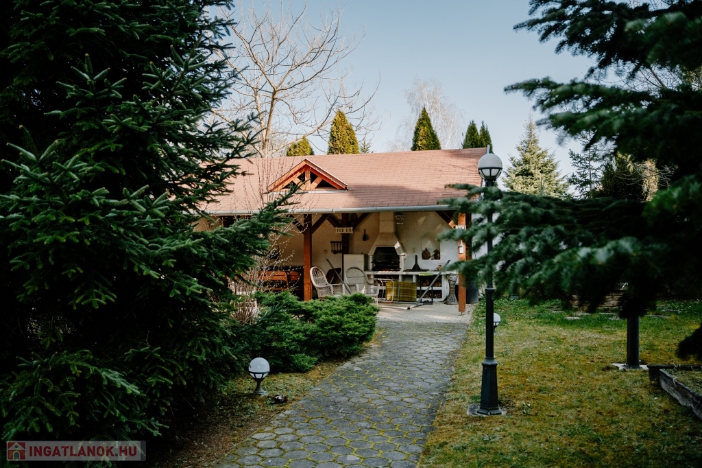 A ház kertjébe lépve csodás látvány tárul elénk, ez tényleg a nyugalom szigete, tekintetünket egyből megragadja a dísz és fenyőfákkal ültetett park mélyén található kemencesütő és grillterasz, valamint a gyerekek számára ki lett alakítva egy játszótér is.