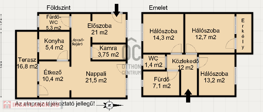 - a földszint:80 m2 nagyságú, melynek helyiségei: 1 tágas nappali -erkéllyel, konyha-étkező-tágas terasz /16,8 m2/kapcsolattal, a Déli fekvésű udvarra, előszoba, fürdő-WC, kamra illetve a lépcsőfeljáró az emeletre
