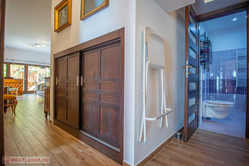 A ház melletti térkövezett parkolóhelyen két autó számára megoldott a parkolás, mely az utcáról egy elektromos úszókapun érhető el. Az ablakok a ház kertje felé néznek, az emeletről gyönyörű kilátás nyílik a környező hegyek felé. A ház beosztása remek, a szobák különnyílóak.