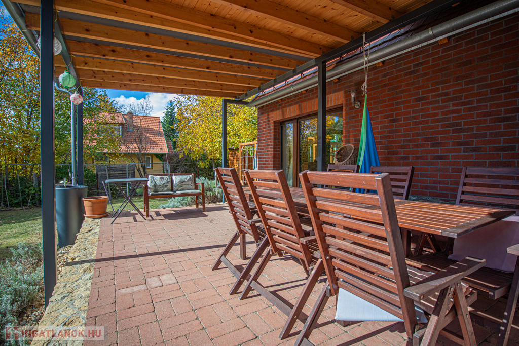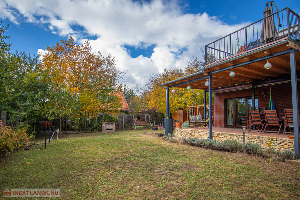 A kertben egy 7,5 m3-es föld alatti víztározó került telepítésre, melybe a ház (eső)csatornarendszere került bevezetésre. A telken számos termő gyümölcsfa és bokor található. A kertben több kerti tároló (melyből egy 10cm szigeteléssel ellátott), csepegtető rendszer, játszótér és sütögető is kiépítésre került. Riasztó rendszer előkészítve.