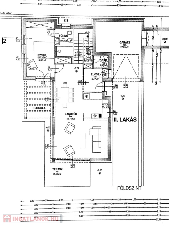 Földszinten Nappali-konyha-étkező (44,7 nm), szoba (14,8 nm), fürdőszoba (4,95), vendég WC, gardrób, előszoba + garázs (27,9 nm) + terasz (25 nm);