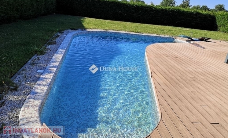 A rendezett, kerítéssel körbe határolt telken 47 m3-es medence, napozóval.