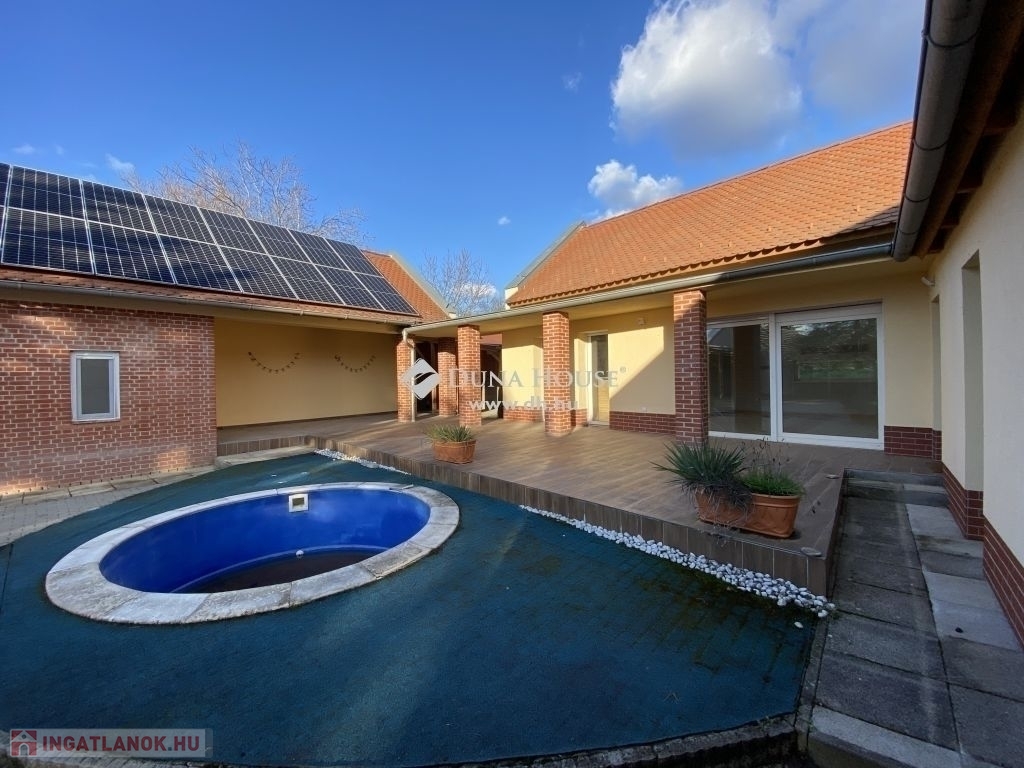 Nagykozárban, Pécstől 10 percre, eladó egy 150nm alapterületű, amerikai konyha nappalis, 4 hálószobás, 3 fürdőszobás, nagy teraszos, modern kialakítású, egyszintes családi ház, 3 állásos garázzsal, fedett autóbeállóval, 2739nm-es területtel.Az ingatlan U alakban körbe öleli a mediterrán teraszt és a medencét, ezzel teljes intimitást biztosítva. A ház déli fekvése és nagy méretű nyílászáróinak köszönhetően rendkívül világos. A tágas nappaliból és az étkezőből közvetlen kijárat nyílik a mediterrán teraszra és a medencéhez. A 4 külön nyíló hálószoba közül az egyik saját fürdőszobával rendelkezik. A ház elrendezése nagyon átgondolt, mivel a hálószobák teljesen elkülönülnek a közös terektől, ezzel nem zavarva a pihenni vágyókat. Az ingatlanban gardrób és háztartási helyiség is helyet kapott. Az udvarban található egy 3 állásos garázs, elektromos kapuval, elektromos autó töltővel, továbbá egy fedett 3 állásos autóbeálló. A garázsból további háztartási helyiségek nyílnak, melyek fűthetők és mosdóval felszereltek. A terület szépen gondozott, térkővel burkolt. Extrák: - 20cmes külső szigetelés- Purhabos födém szigetelés- Fűtés gáz Cirkó + klíma, padló fűtés , szobákban radiátor- Elektromos alumínium redőny- 10 KW napelemes rendszer- Elektromos autó töltő- Elektromos garázskapu- Elektromos kapunyitás- Kamera rendszer - Klíma- Riasztó- MedenceA ház méreteit és adottságát tekintve, akár nagycsaládosok számára, illetve a tágas életteret kedvelőknek is tökéletes választás.Ingatlan tehermentes, rövid időn belül költözhető!Amennyiben felkeltette érdeklődését, keressen bizalommal!