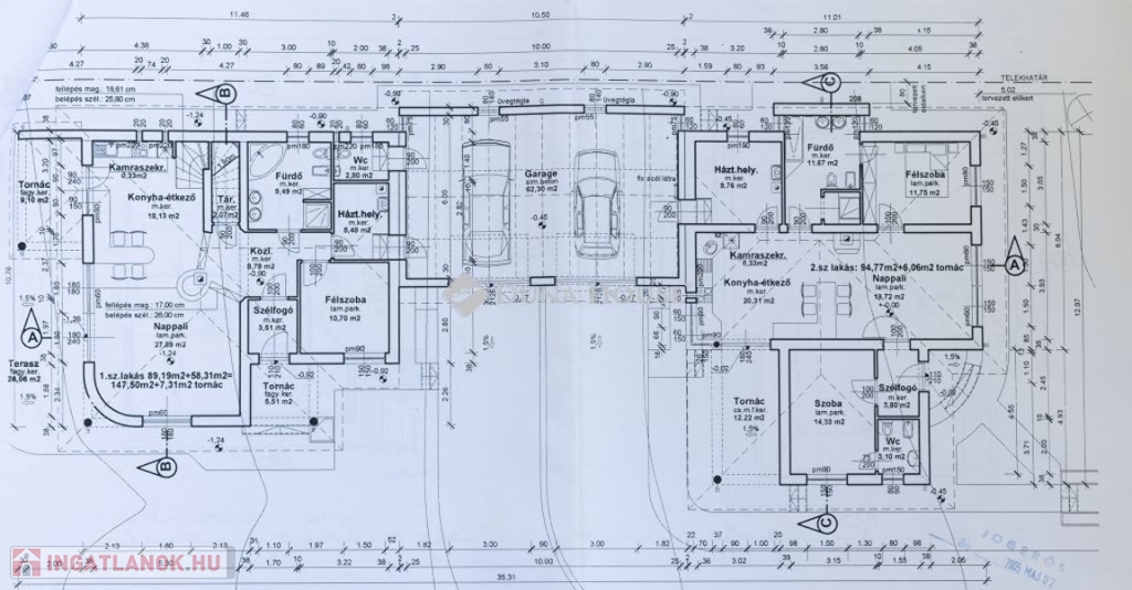 A két lakást egy fűthető 60m²-es dupla garázs köti össze, benne kialakítva: