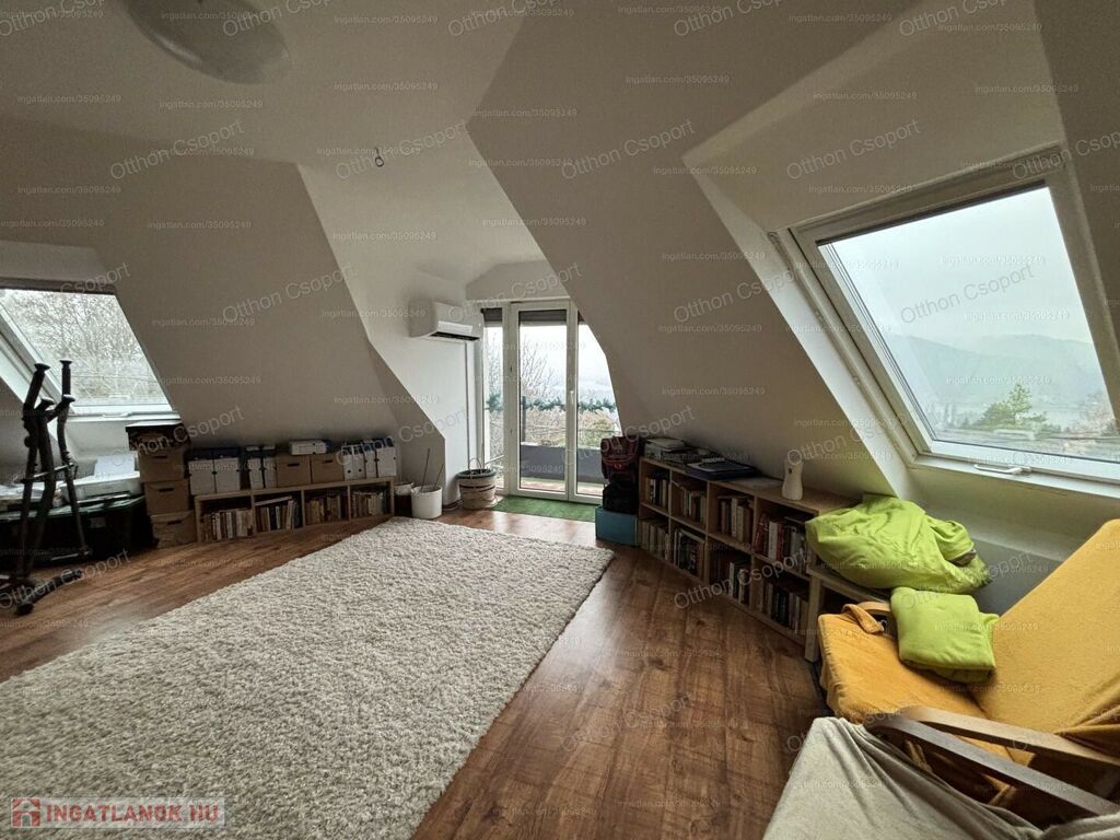 A lépcsőházban még egy szinttel feljebb a tetőtérbe jutunk. Itt egy nappaliból, két hálószobából és egy zuhanyzós fürdőből álló lakótér található, pazar panorámával, kicsi erkéllyel.